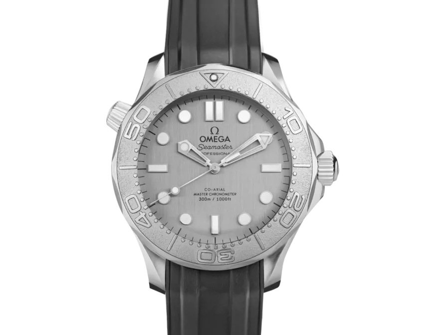 La montre est présentée sur un bracelet en caoutchouc gris intégré à boucle déployante. Elle est entraînée par le calibre OMEGA Co-Axial Master Chronometer 8806, que l’on peut admirer à travers le fond en verre saphir.