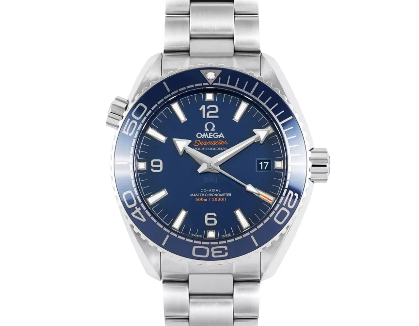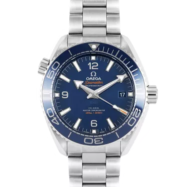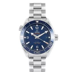 Omega Seamaster Planet Ocean 600M 43,5 mm avec son verre saphir inrayable, cadran en céramique bleu avec chiffres arabes et date à 3h. La lunette unidirectionnelle en céramique bleue avec échelle de plongée OMEGA Liquidmetal™.