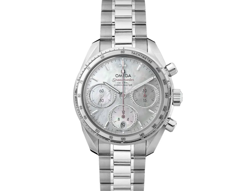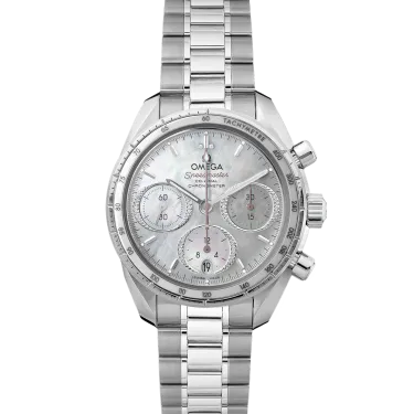 La collection Speedmaster 38 mm se caractérise par sa simplicité, sa taille unique et ses multiples coloris, tout en restant fidèle à l’esthétique et au patrimoine du plus célèbre des chronographes OMEGA. Ce modèle est doté d'un boîtier en acier inoxydable cerclé d'une lunette présentant une échelle tachymétrique sur un anneau en céramique blanche. Le cadran en nacre blanche arbore des compteurs ovales horizontaux bordés de diamants et un guichet de date ovale vertical à 6 heures. Les index rhodiés côtoient les aiguilles rhodiées ou roses. Avec son fond frappé d'un médaillon représentant l’hippocampe historique, la montre repose sur un bracelet en acier inoxydable. Elle est entraînée par le calibre OMEGA Co-Axial 3330.