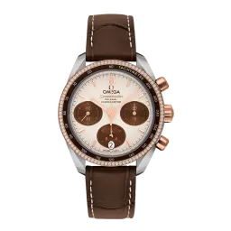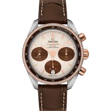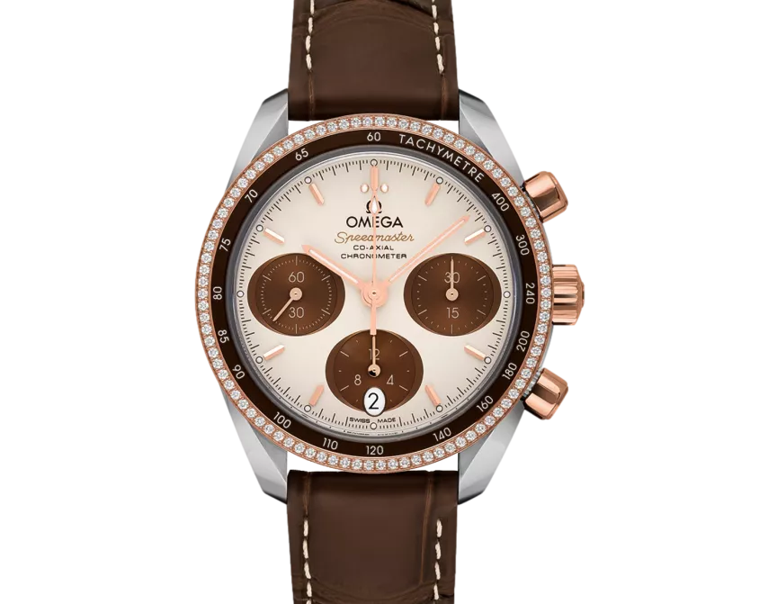Montre Omega Speedmaster Co-Axial Chronograph 38 mm. Référence du modèle : 324.28.38.50.02.002. Boîtier en acier inoxydable. Lunette en or rose 18K sertie de diamants. Cadran brun. Mouvement automatique. Bracelet en cuir d'alligator brun avec surpiqûres blanches.
