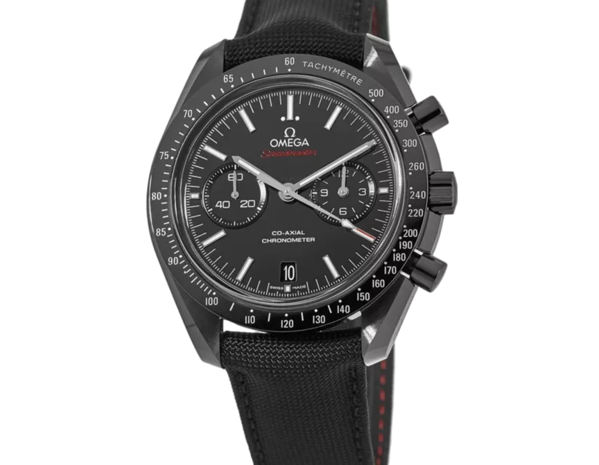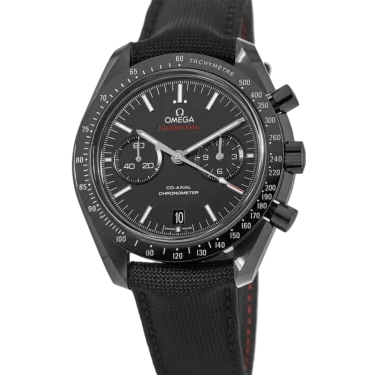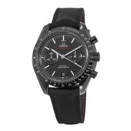 Venue des confins de l'univers, voici une impressionnante version de la Moonwatch « Dark Side of the Moon ». Usinée à partir d'un seul bloc de céramique, l'emblématique boîtier de 44,25 mm de la montre Speedmaster est doté d'une lunette en céramique satinée avec une échelle tachymétrique en nitrure de chrome mat. Le cadran est également en céramique noire polie, avec des anneaux de compteurs noircis appliqués à 3 heures et 9 heures et des index appliqués en or blanc 18K. Animée par le calibre OMEGA Co-Axial 9300, cette montre audacieuse possède un bracelet en nylon noir et un nouveau fermoir repliable en céramique et titane. Les aiguilles sont en or blanc 18K polies au diamant, à l'exception de l'aiguille centrale des secondes à pointe rouge, polie et rhodiée. Boucle déployante.