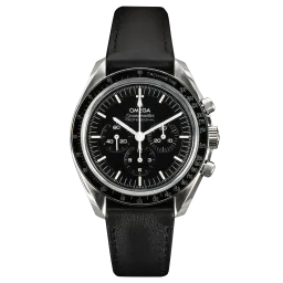 La Speedmaster Moonwatch est présentée sur un bracelet en cuir. Cette Moonwatch de 42 mm en acier inoxydable est dotée d'un verre saphir sur le devant et sur le fond du boîtier. La montre est animée par le calibre OMEGA Co-Axial Master Chronometer 3861, qui alimente le sous-cadran de la petite seconde, les compteurs 30 minutes et 12 heures, ainsi que la fonction centrale du chronographe.