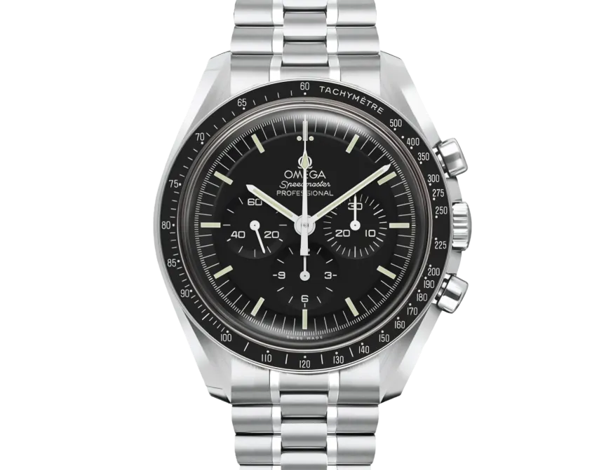 La Speedmaster Moonwatch est présentée sur un bracelet brossé à cinq arches par rangée. Cette Moonwatch de 42 mm en acier inoxydable est dotée d'un verre saphir sur la face avant et sur le fond du boîtier. La montre est animée par le calibre OMEGA Co-Axial Master Chronometer 3861, qui alimente le sous-cadran de la petite seconde, les compteurs 30 minutes et 12 heures, ainsi que la fonction centrale du chronographe.