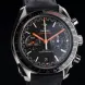 Cette Speedmaster Racing Master Chronometer de 44,25 mm possède un boîtier en acier inoxydable. Elle est surmontée d'une lunette en céramique noire frappée de l’emblématique échelle tachymétrique en Liquidmetal™. Le bracelet en cuir noir microperforé laisse apparaître la couleur orange de l’insert en caoutchouc.