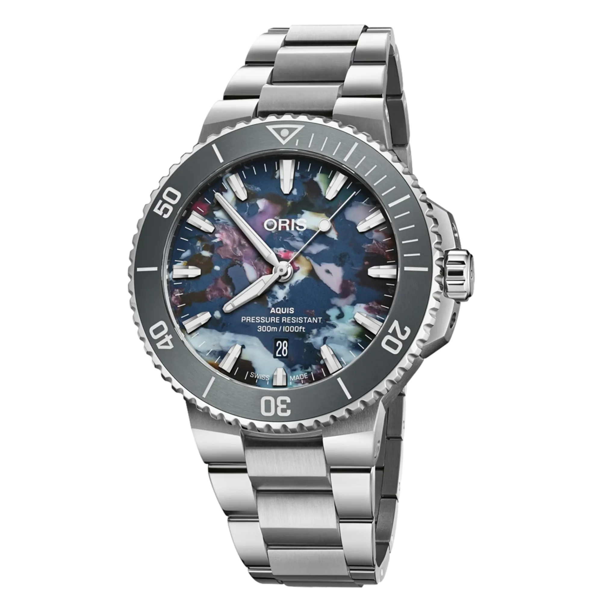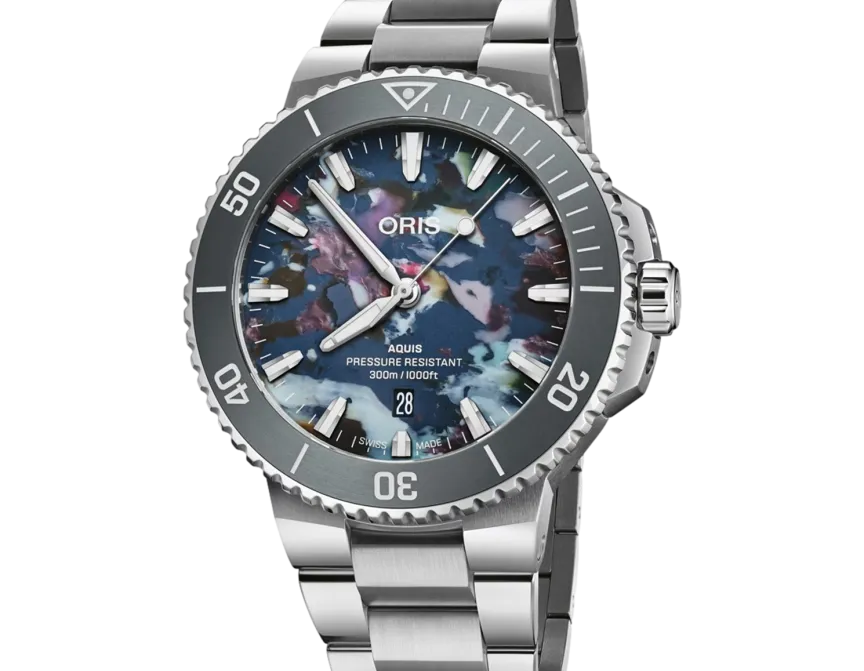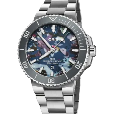 Boîtier multipièces en acier inoxydable de 43,50 mm, lunette supérieure avec échelle des minutes en céramique. Cadran multicolore, saphir bombé des deux côtés, traitement antireflet à l'intérieur. Verre minéral transparent vissé en acier inoxydable. Aiguilles centrales pour les heures, les minutes et les secondes, guichet dateur, date instantanée, correcteur de date, dispositif de réglage fin et arrêt seconde. Mouvement automatique, calibre 733-1.
