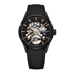 Encadré par un boîtier en acier de 42 mm, l'assemblage du mouvement et les détails ajourés sont la clé de l'esthétique horlogère finale de ce garde-temps. La caractéristique distinctive reste le positionnement à 6 heures du cadran avant de son balancier visible. Le cadran, cependant, a été ouvert, exposant la beauté de la fabrication et soulignant la richesse du savoir-faire horloger, tout en lui insufflant son attitude libre distinctive. Résistance à l'eau à 100M.