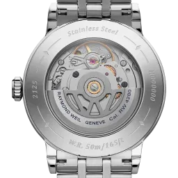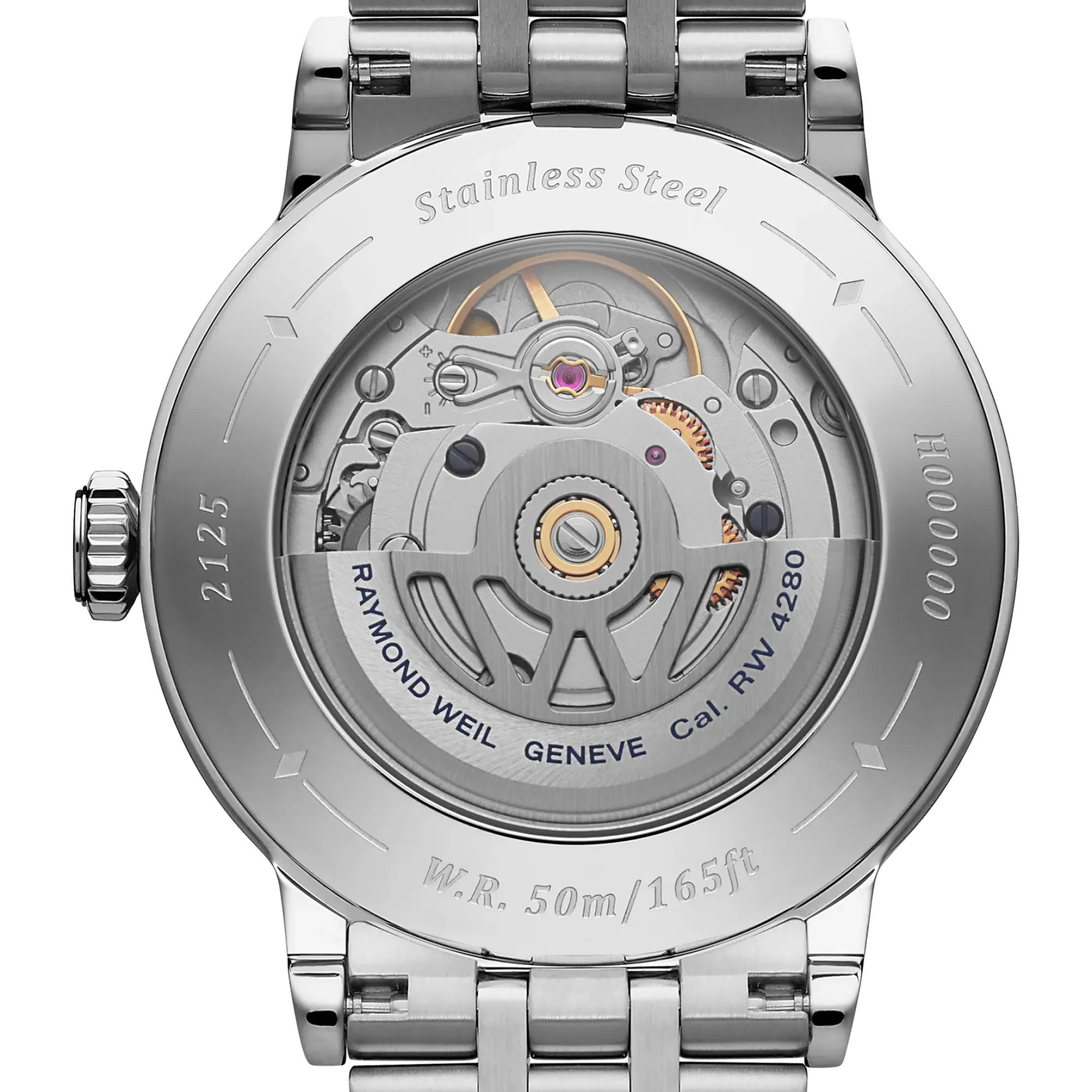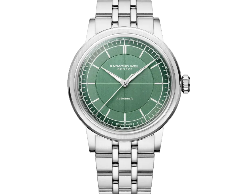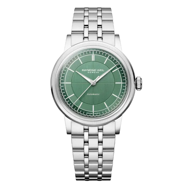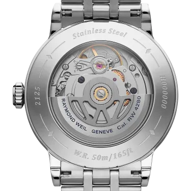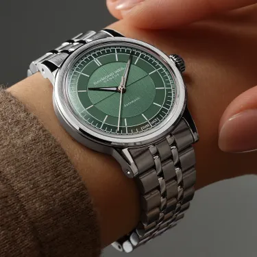 En y regardant de plus près, on remarque que le cadran présente des finitions contrastées : la piste des heures est lisse, celle des minutes est hélicoïdale et la partie centrale du cadran est ornée d'un délicat brossage vertical. La lunette est décorée d'un brossage satiné vertical qui contraste magnifiquement avec le biseau hautement poli qui l'entoure. Cette juxtaposition de deux finitions renforce le niveau global de finition. Un fond saphir permet d'admirer le mouvement à remontage automatique et la masse oscillante en forme de « W », signature horlogère de RAYMOND WEIL.