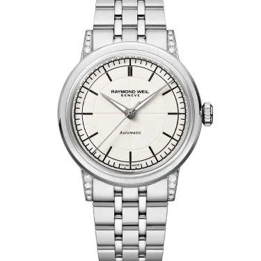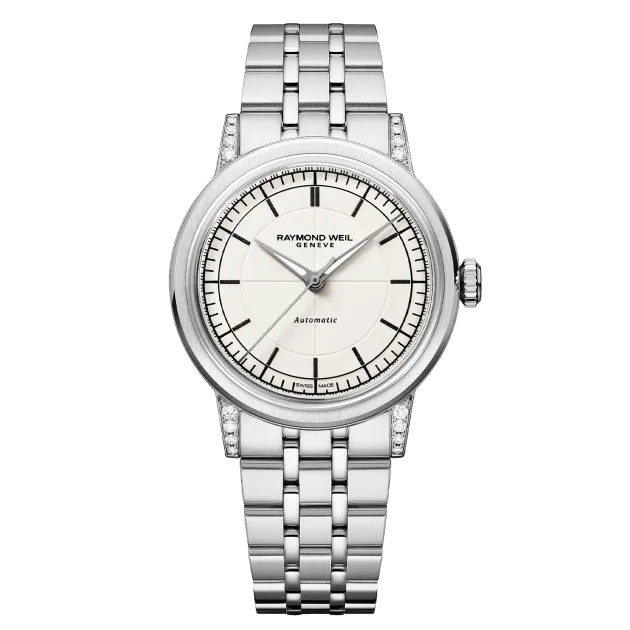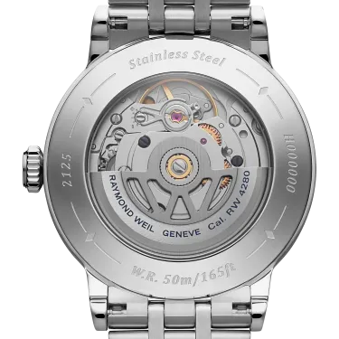 Le fond saphir permet d'admirer le mouvement automatique et la masse oscillante en forme de « W », signature horlogère de RAYMOND WEIL.