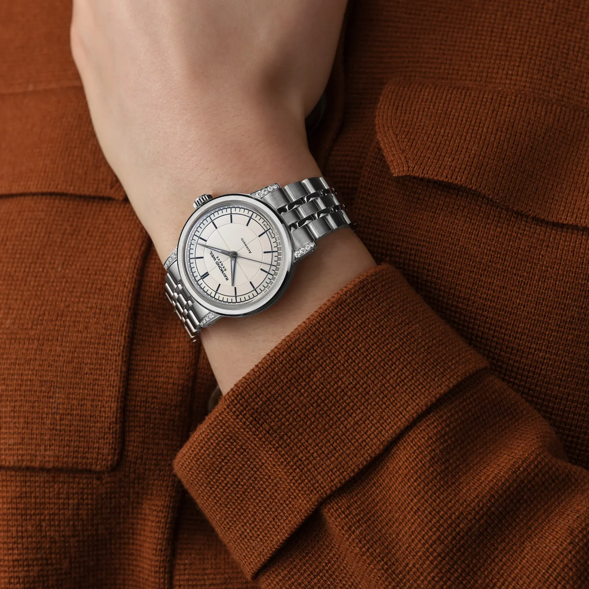 La référence 2125 allie une sensibilité contemporaine à une esthétique néo-vintage. La montre Millesime à seconde centrale se décline dans des couleurs de cadran très distinctives, avec des lignes géométriques et un cadran sectoriel.