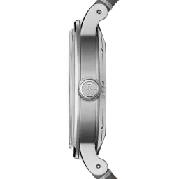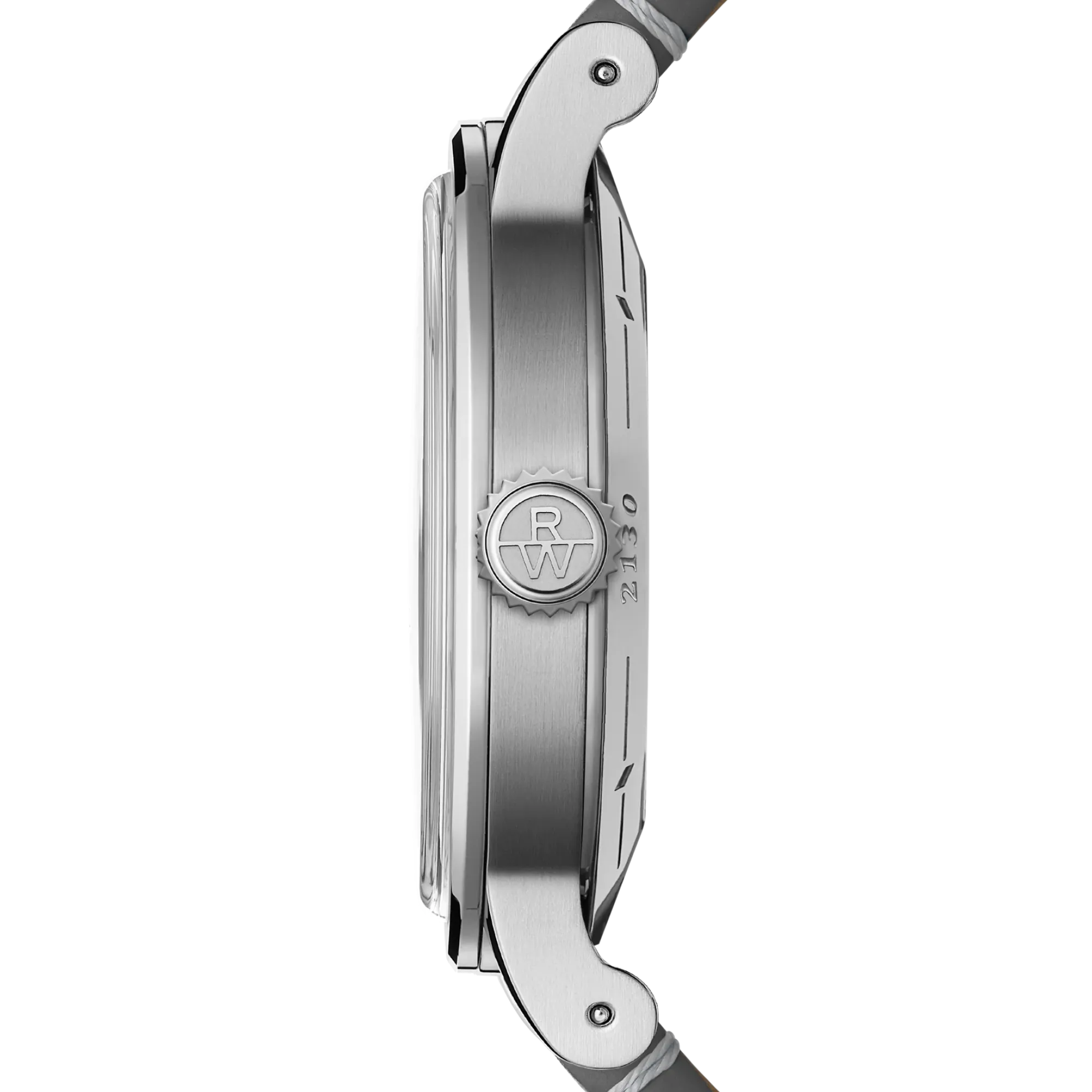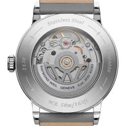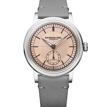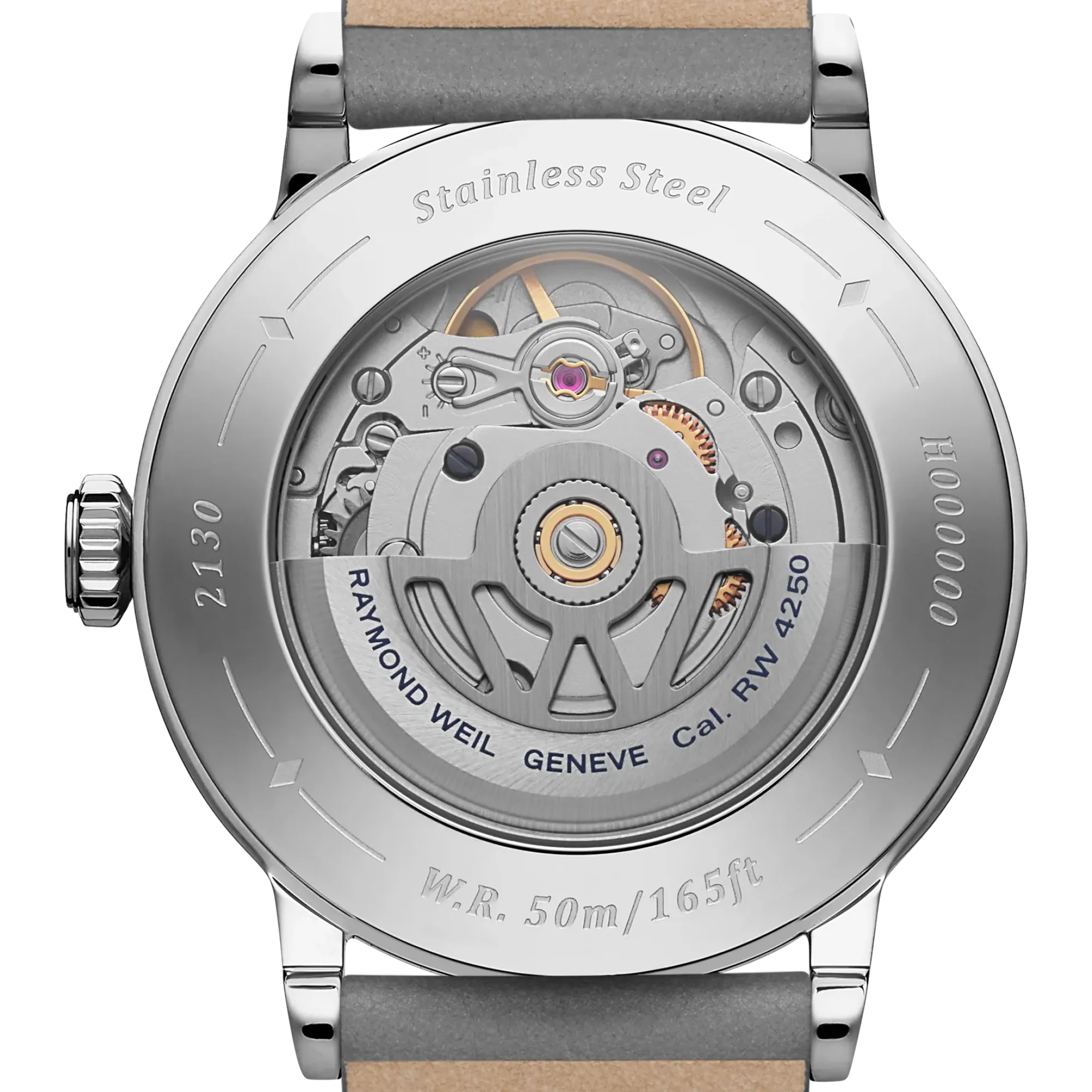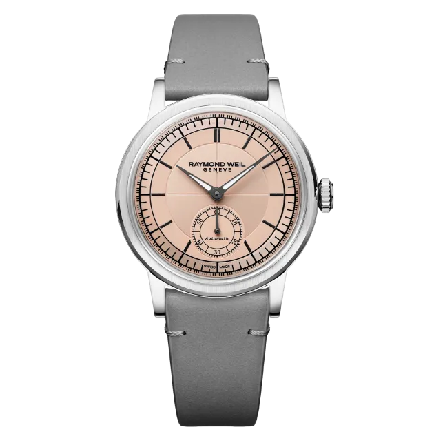 En y regardant de plus près, on remarque des finitions contrastées : la piste des heures est lisse, celle des minutes est hélicoïdale et la partie centrale du cadran est ornée d'un délicat brossage vertical. La Millésime dispose d'un petit cadran des secondes à 6 heures, délimité par un cercle encastré soigné, créant un jeu de profondeurs raffiné, enrichi par une sélection de détails de bon goût. La lunette est décorée d'un brossage satiné vertical qui contraste merveilleusement avec le biseau hautement poli à proximité. Cette juxtaposition de deux finitions renforce le niveau global de finition. Un fond saphir permet d'admirer le mouvement à remontage automatique et la masse oscillante en forme de « W », signature horlogère de RAYMOND WEIL. Le bracelet en cuir de veau gris véritable est rehaussé d'un détail unique en forme de W.