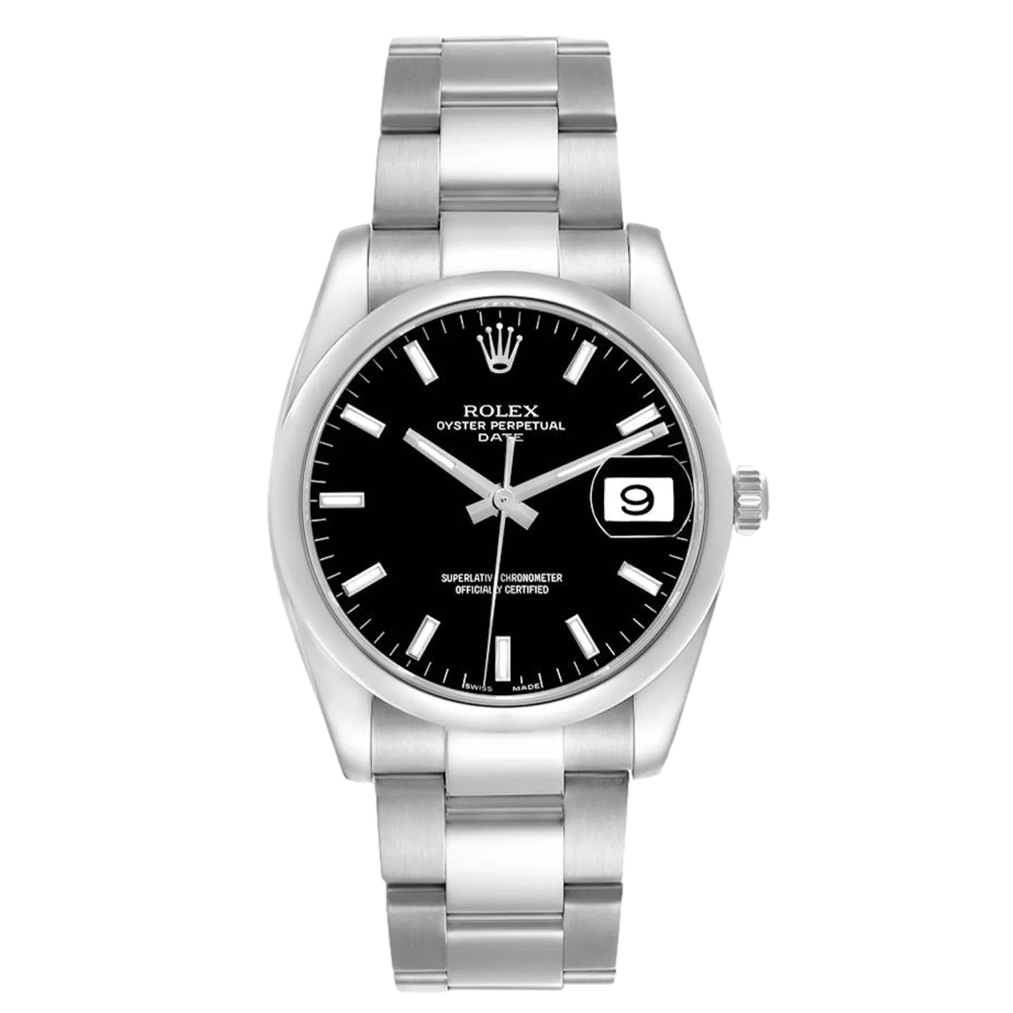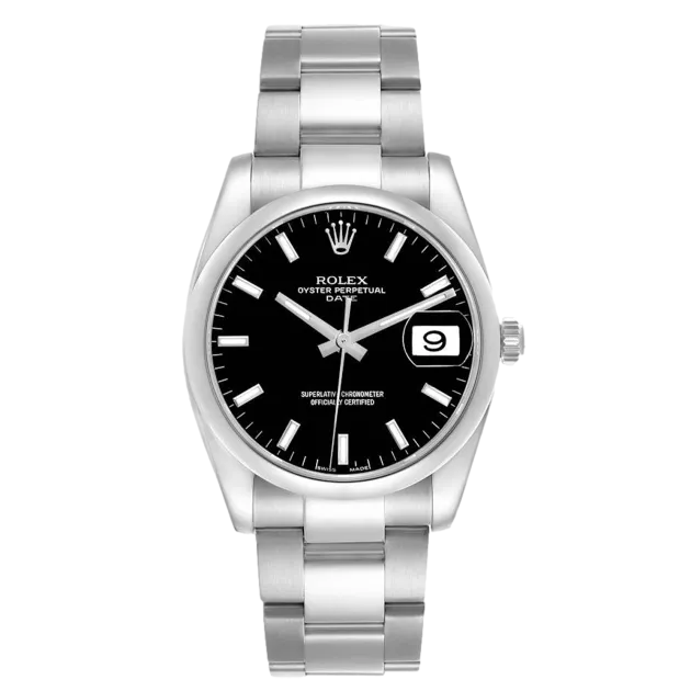 Rolex Oyster Perpetual 115200 34 mm, boîtier, lunette et bracelet Oyster en acier inoxydable, boucle déployante, cadran noir, mouvement automatique, mouvement/calibre 3135, étanchéité 10 ATM, avec boîte d'origine, papiers d'origine et en parfait état de fonctionnement. Cette montre a été vérifiée, certifiée et a subi un test d'étanchéité. Elle bénéficie d'une garantie de 2 ans à compter de la date d'achat.