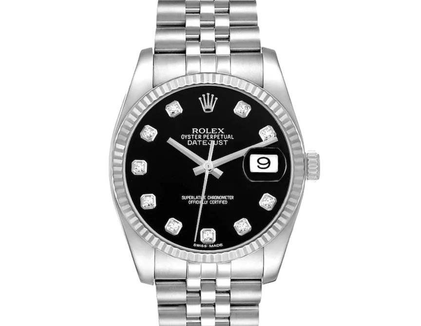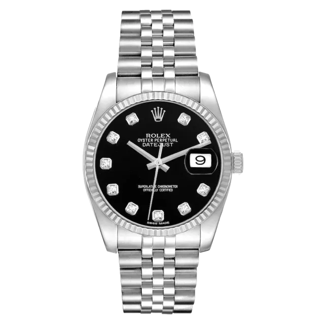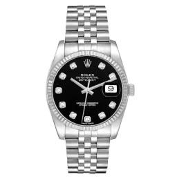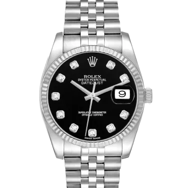 Rolex Datejust 116234 36 mm, boîtier en acier inoxydable et bracelet Jubilé, lunette en or blanc, boucle déployante, cadran noir, mouvement automatique, mouvement/calibre 3135, étanchéité 10 ATM, avec boîte d'origine, papiers d'origine et en parfait état de fonctionnement. Cette montre a été vérifiée, certifiée et a subi un test d'étanchéité. Elle bénéficie d'une garantie de 2 ans à compter de la date d'achat.