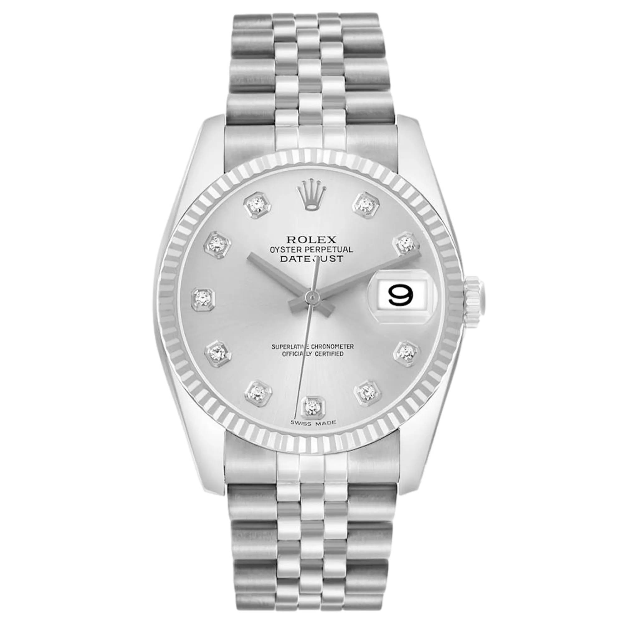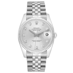 Rolex Datejust 116234 36 mm, boîtier en acier inoxydable et bracelet Jubilee, lunette en or blanc, boucle déployante, cadran argenté, mouvement automatique, mouvement/calibre 3135, étanchéité à 10 ATM, livrée avec son coffret d'origine et ses papiers d'origine, en parfait état de marche. Cette montre a été contrôlée, certifiée et a subi un test d'étanchéité ; elle bénéficie d'une garantie de 2 ans à compter de la date d'achat.