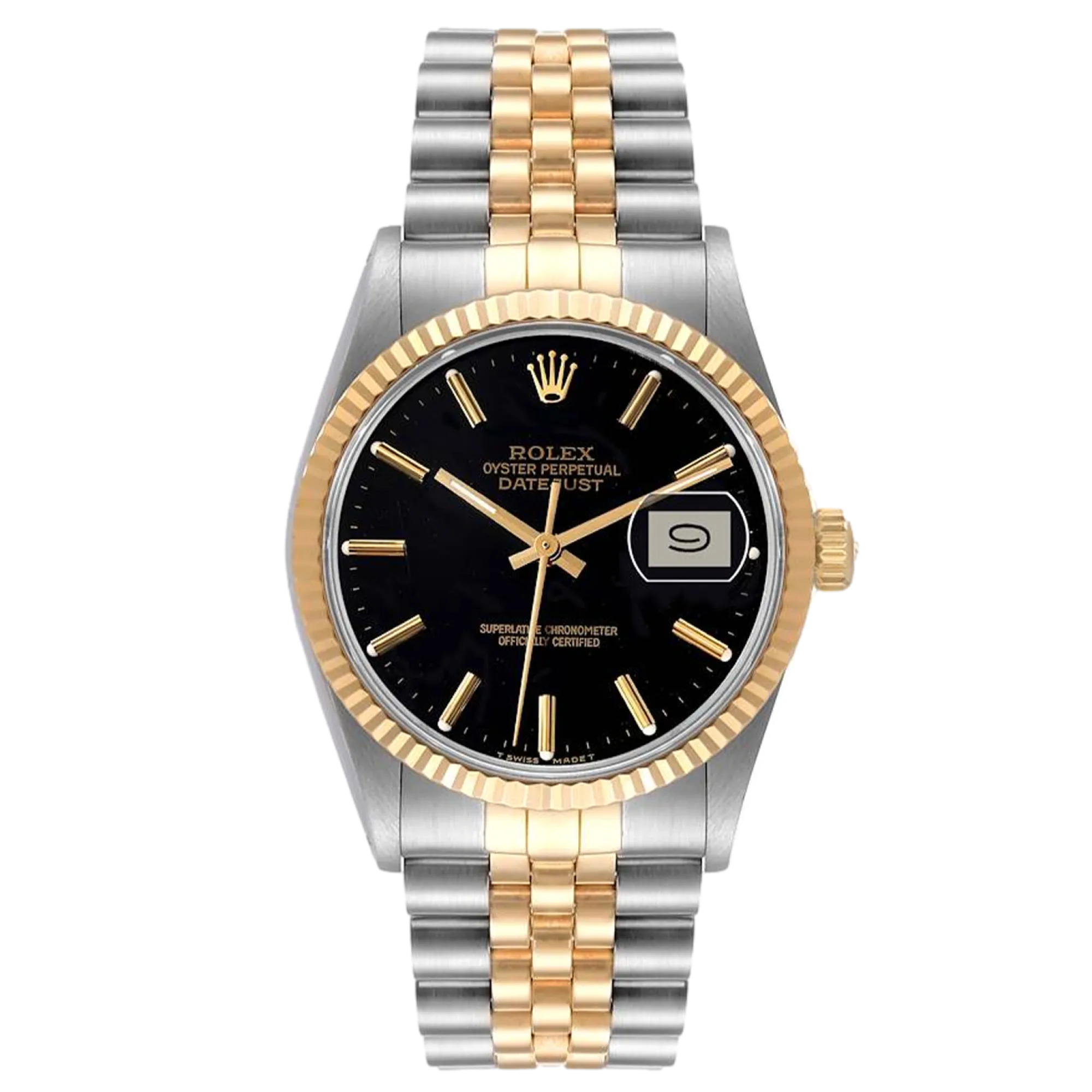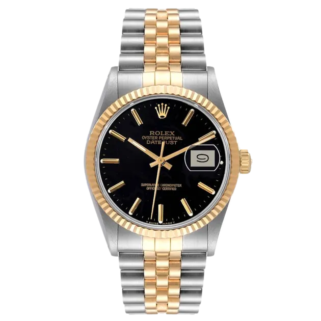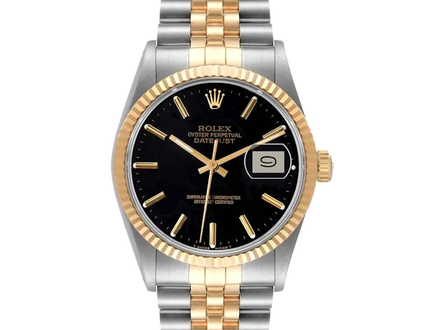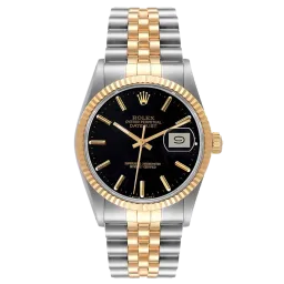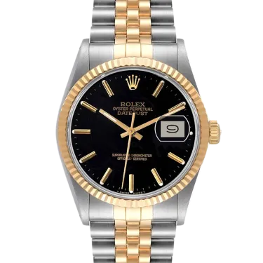 Rolex Datejust 16013 36 mm, boîtier en acier inoxydable/or et bracelet Jubilé, lunette en or jaune, boucle déployante, cadran noir, mouvement automatique, mouvement/calibre 3035, étanchéité 10 ATM, avec boîte d'origine, papiers d'origine et en parfait état de fonctionnement. Cette montre a été vérifiée, certifiée et a subi un test d'étanchéité. Elle bénéficie d'une garantie de 2 ans à compter de la date d'achat.