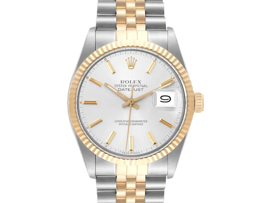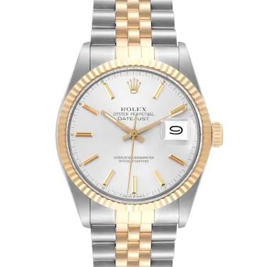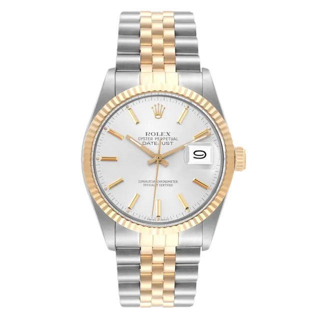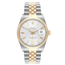 Rolex Datejust 16013 36 mm, boîtier en acier inoxydable/or et bracelet Jubilé, lunette en or jaune, boucle déployante, cadran argenté, mouvement automatique, mouvement/calibre 3035, étanchéité 10 ATM, avec boîte d'origine, papiers d'origine et en parfait état de fonctionnement. Cette montre a été vérifiée, certifiée et a subi un test d'étanchéité. Elle bénéficie d'une garantie de 2 ans à compter de la date d'achat.