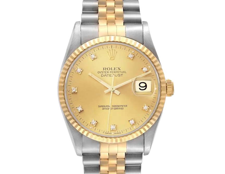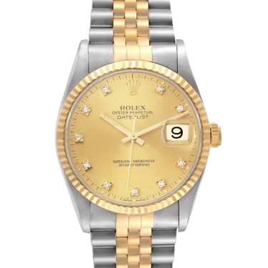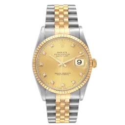 Rolex Datejust 16233 36 mm, boîtier en acier inoxydable/or et bracelet Jubilé, lunette en or jaune, boucle déployante, cadran champagne, mouvement automatique, mouvement/calibre 3135, étanchéité 10 ATM, avec boîte d'origine, papiers d'origine et en parfait état de fonctionnement. Cette montre a été vérifiée, certifiée et a subi un test d'étanchéité. Elle bénéficie d'une garantie de 2 ans à compter de la date d'achat.