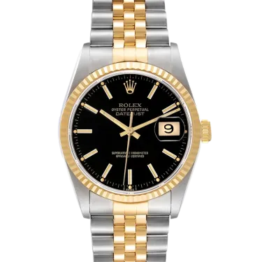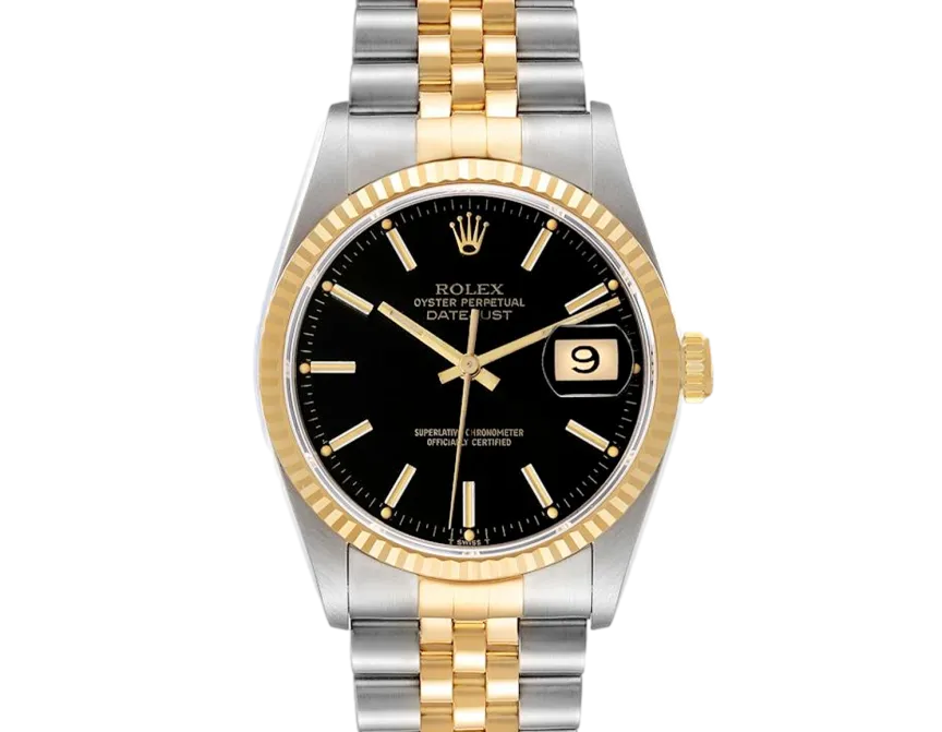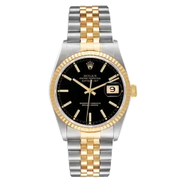 Rolex Datejust 16233 36 mm, boîtier en or/acier inoxydable et bracelet Jubilé, lunette en or jaune, boucle déployante, cadran noir, mouvement automatique, mouvement/calibre 3135, étanchéité 10 ATM, avec boîte d'origine, papiers d'origine et en parfait état de fonctionnement. Cette montre a été vérifiée, certifiée et a subi un test d'étanchéité. Elle bénéficie d'une garantie de 2 ans à compter de la date d'achat.