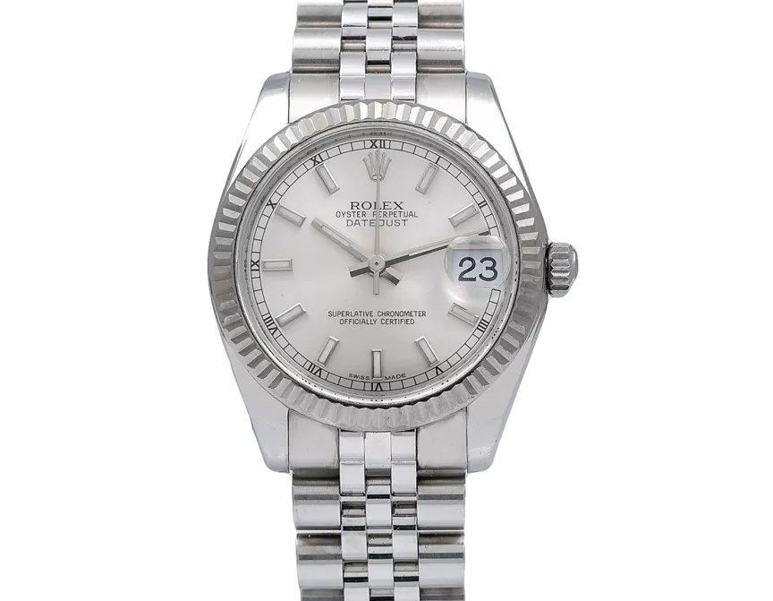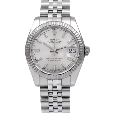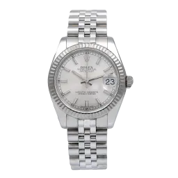 Rolex Datejust Lady 31 178274 Mouvement : Automatique Taille du boîtier : 31 mm Matériau du boîtier : Acier et or blanc Matériau du bracelet : Acier (Jubilee) Type de cadran : Argenté à index bâtons Étanchéité : 100 mètres