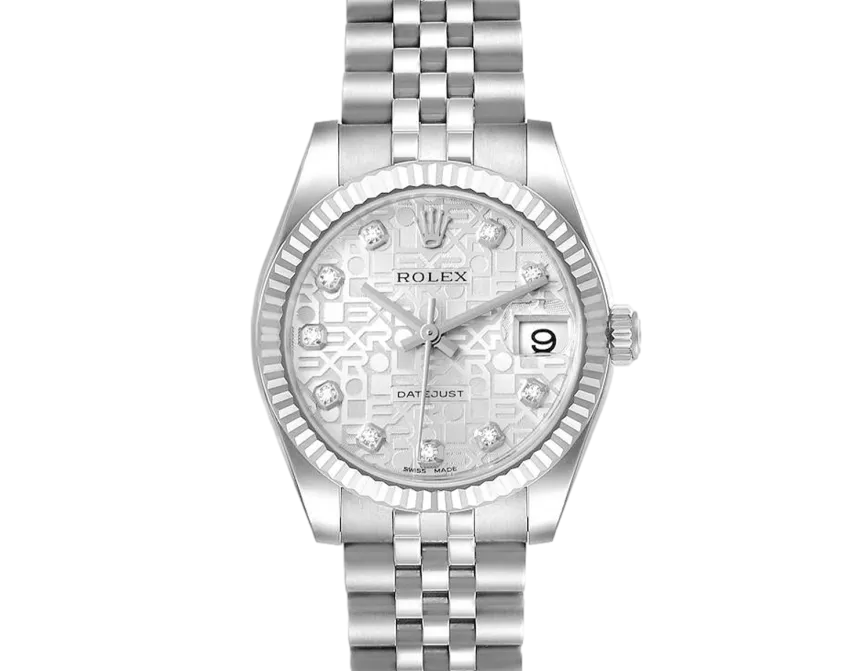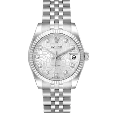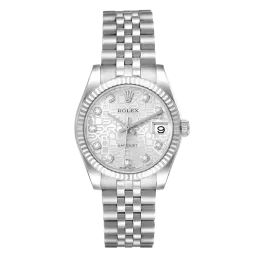Rolex Datejust Lady 31 178274 Mouvement : Automatique Taille du boîtier : 31 mm Matériau du boîtier : Acier et or blanc Matériau du bracelet : Acier (Jubilee) Type de cadran : Argenté Jubilee Diamond Étanchéité : 100 mètres