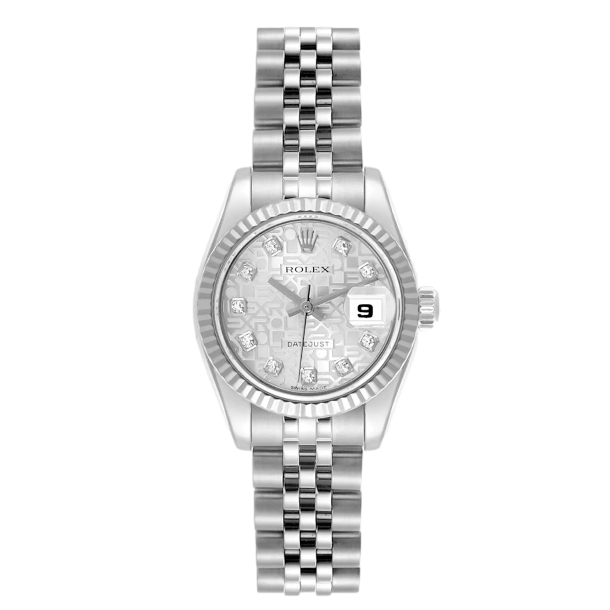 Rolex Datejust Lady 179174 Mouvement : Automatique Taille du boîtier : 26 mm Matériau du boîtier : Acier Matériau du bracelet : Acier (Oyster) Type de cadran : Argent Jubilee Diamond Étanchéité : 100 mètres