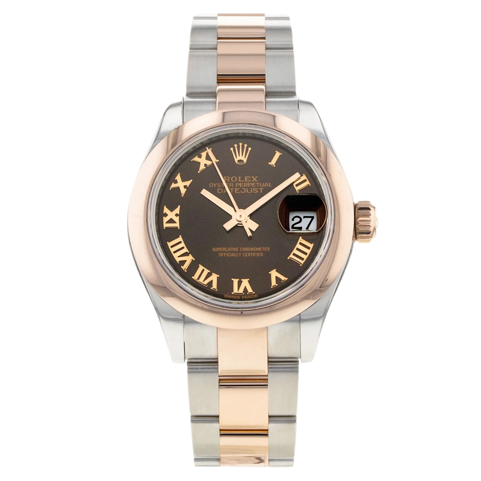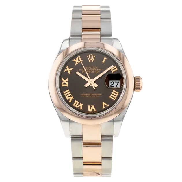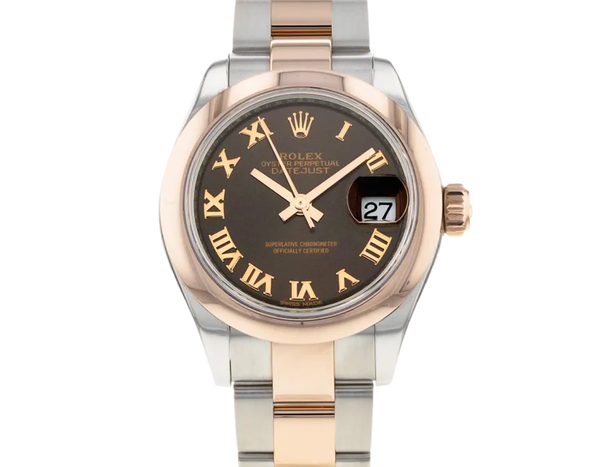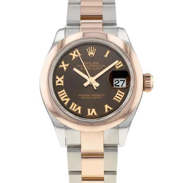 Rolex Datejust Lady 28 279161 Mouvement : Automatique Taille du boîtier : 28 mm Matériau du boîtier : Acier et or rose Matériau du bracelet : Acier et or rose (Oyster) Type de cadran : Chocolat avec chiffres romains Étanchéité : 100 mètres