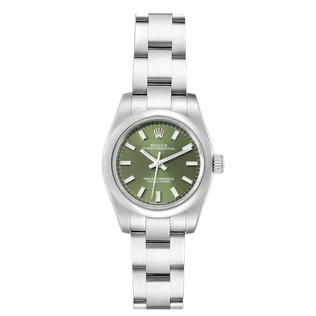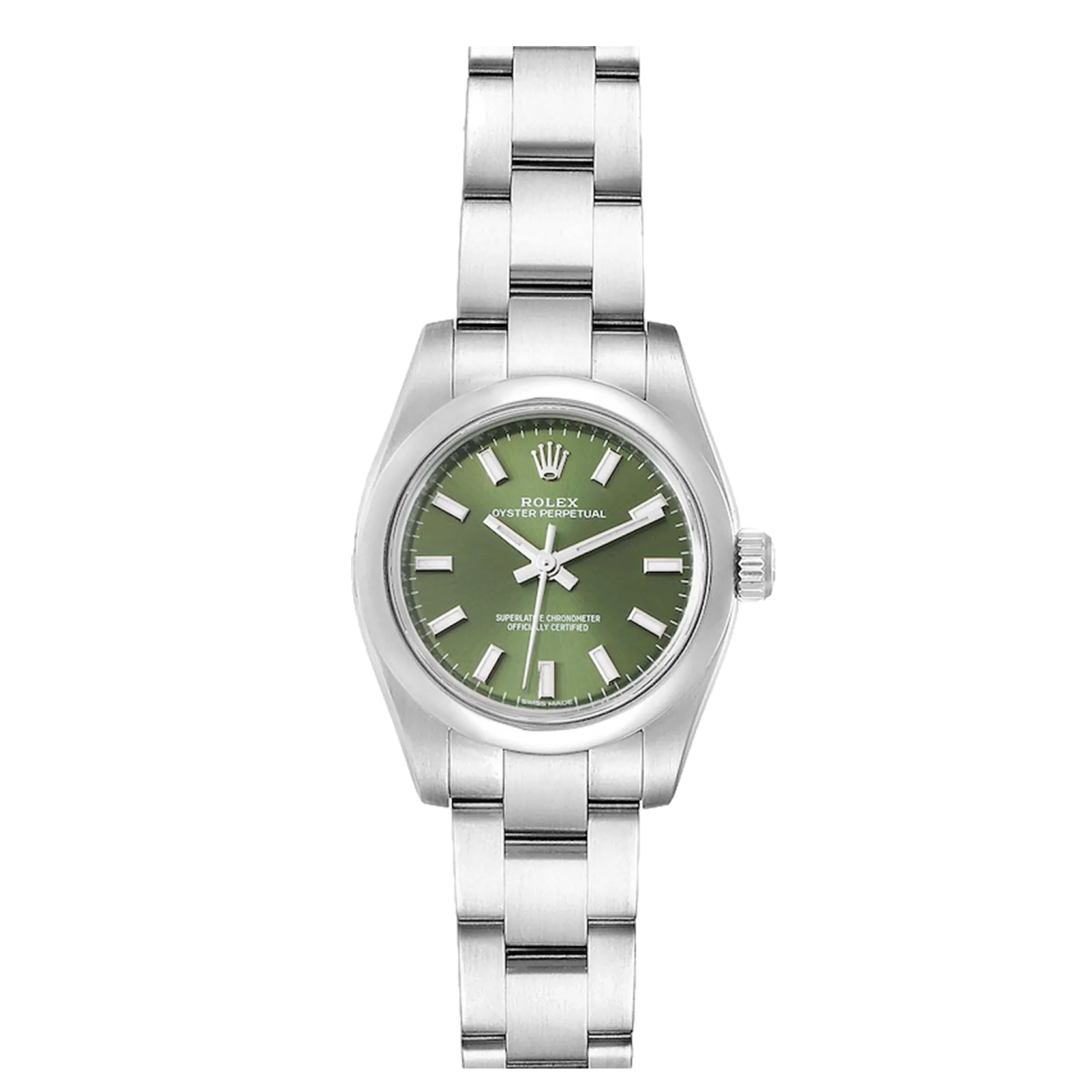 Rolex Lady Oyster Perpetual 176200 Mouvement : Automatique Taille du boîtier : 26 mm Matériau du boîtier : Acier Matériau du bracelet : Acier (Oyster) Type de cadran : Vert Baton Étanchéité : 100 mètres