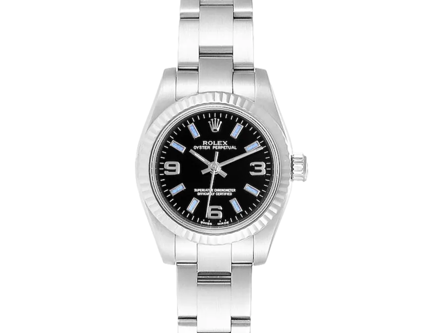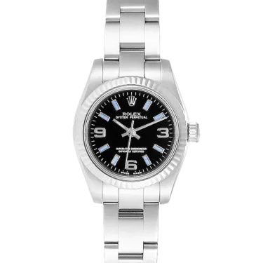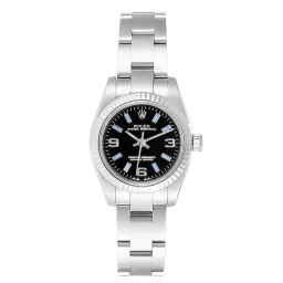 Rolex Lady Oyster Perpetual 176234 Mouvement : Automatique Taille du boîtier : 26 mm Matériau du boîtier : Acier et or blanc Matériau du bracelet : Acier (Oyster) Type de cadran : Noir avec chiffres arabes Résistance à l'eau : 100 mètres