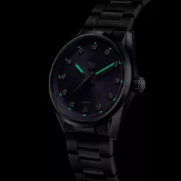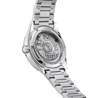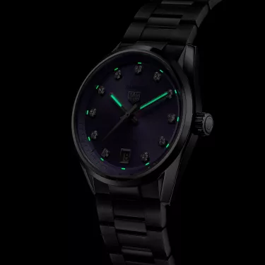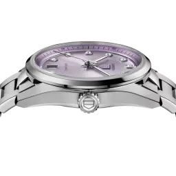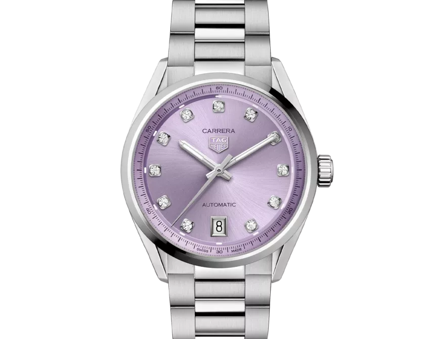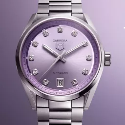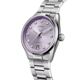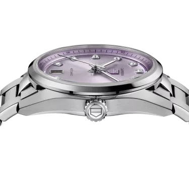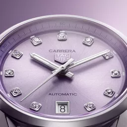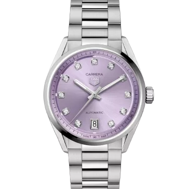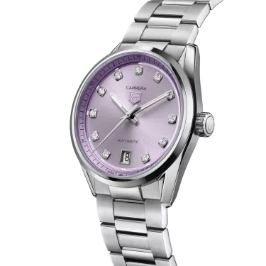 D’une élégance absolue, la TAG Heuer Carrera Date en 36 mm associe un cadran lilas brossé azuré à des index sertis de diamants. Animée par le mouvement Calibre 7, elle offre une réserve de marche de 56 heures et s’associe à un bracelet racé à maillons en H alliant confort et style.