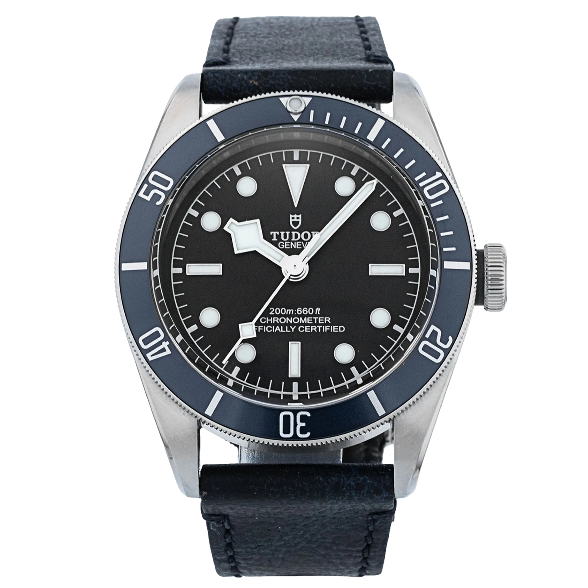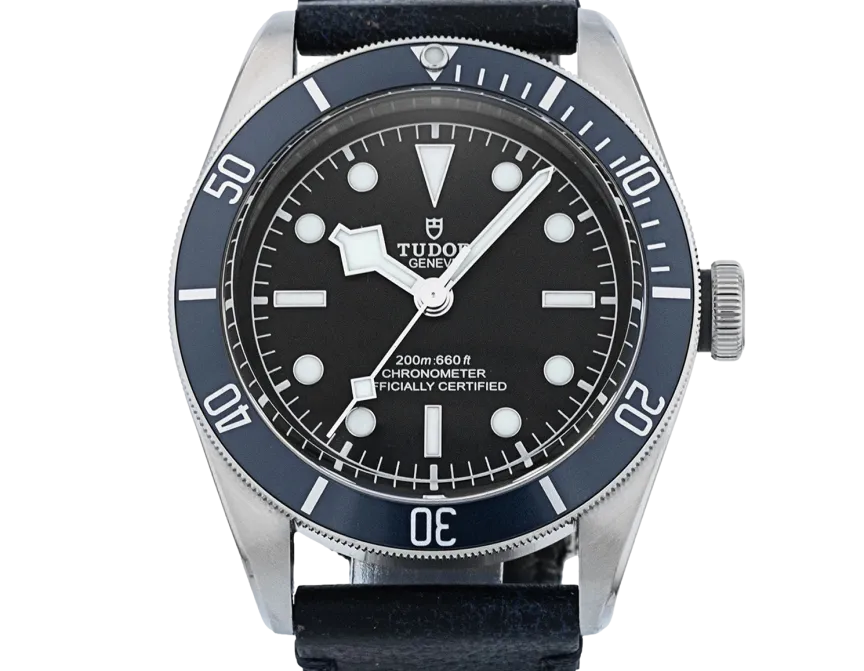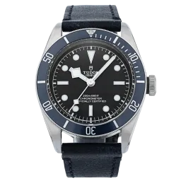Tudor Black Bay M79230B-0002 Mouvement : Automatique Taille du boîtier : 41 mm Matériau du boîtier : Acier Matériau du bracelet : Cuir - Bleu Type de cadran : Noir Étanchéité : 200 mètres