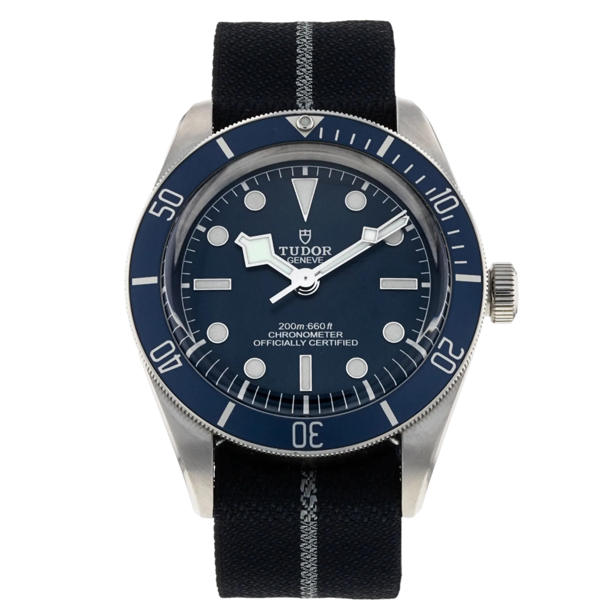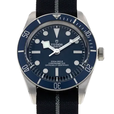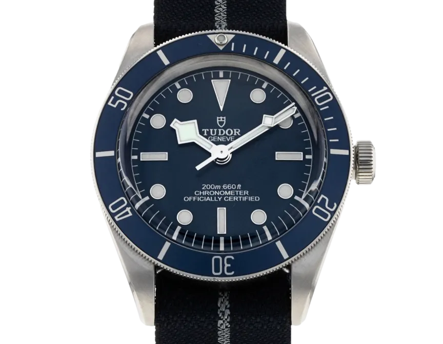 Tudor Black Bay 58 M79030B-0003 Mouvement : Automatique Taille du boîtier : 39 mm Matériau du boîtier : Acier Matériau du bracelet : Tissu - Bleu Type de cadran : Bleu Étanchéité : 200 mètres