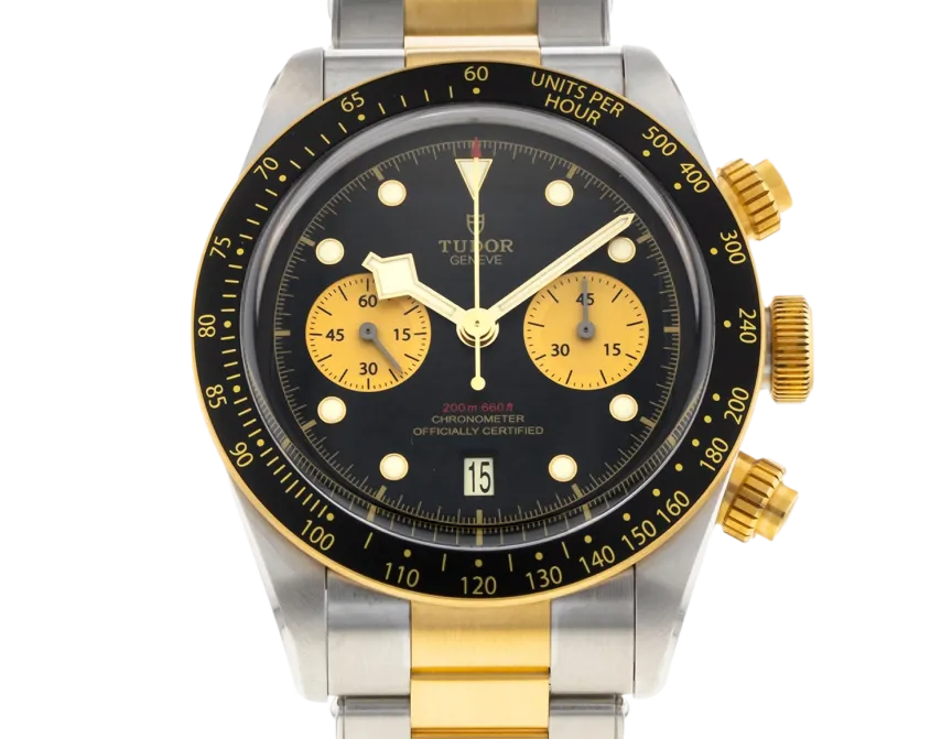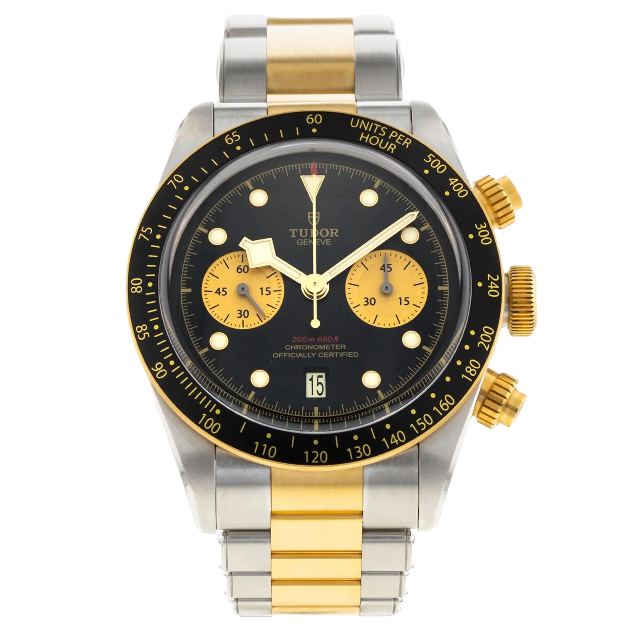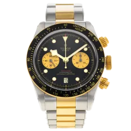 Tudor Black Bay Chrono M79363N-0001 Mouvement : Automatique Taille du boîtier : 41 mm Matériau du boîtier : Acier et or jaune Matériau du bracelet : Acier et or jaune Type de cadran : Noir Étanchéité : 200 mètres