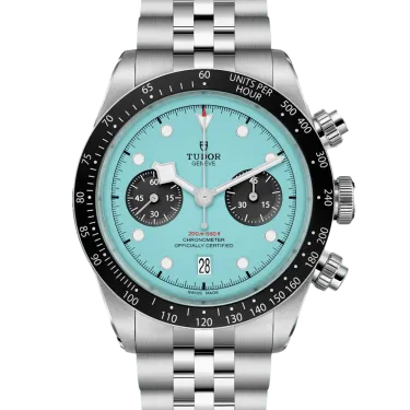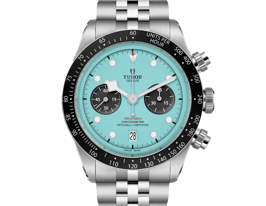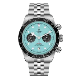 Tudor Black Bay Chrono Miami Blue 41 mm ; Boîtier en acier avec finition polie et satinée ; Mouvement manufacture Calibre MT5813 (COSC) ; Mouvement mécanique à remontage automatique avec système de rotor bidirectionnel ; Réserve de marche d'environ 70 heures ; Couronne vissée en acier inoxydable avec la rose TUDOR en relief ; poussoirs vissés à 2 et 4 heures ; Étanche jusqu'à 200 m (660 ft) ; Lunette fixe en acier inoxydable avec disque en aluminium anodisé noir mat et échelle tachymétrique ; Cadran turquoise avec compteurs noirs bombé, date à 6 heures ; Verre saphir bombé et bracelet en acier inoxydable.