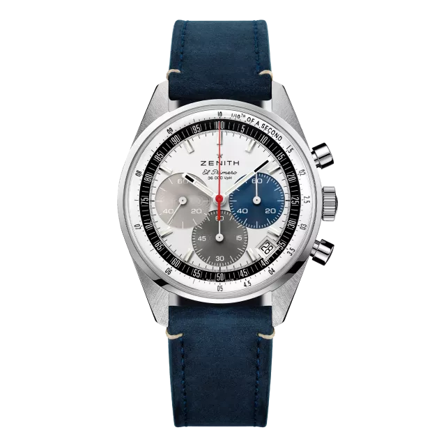 La montre CHRONOMASTER Original possède un boîtier en acier de 38mm aux mêmes proportions que l'A386, associé au cadran tricolore emblématique et à un bracelet en cuir bleu. Elle est animée par le mouvement de chronographe automatique haute fréquence El Primero 3600 avec fonction chronographe affichant les 1/10e de seconde et réserve de marche de 60 heures.