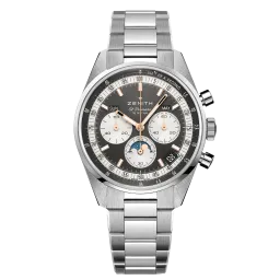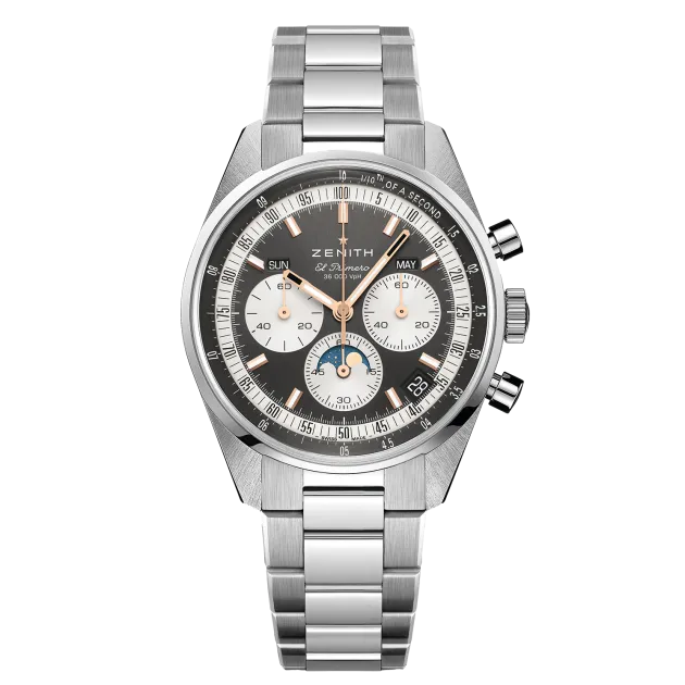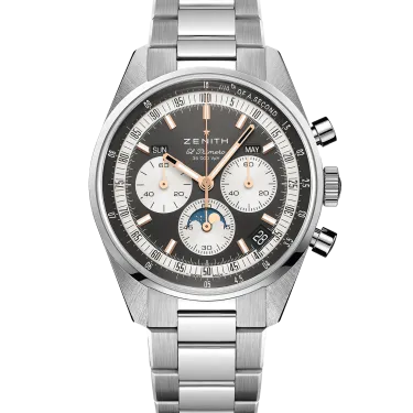 La montre CHRONOMASTER Original Triple Calendar est dotée d'un boîtier en acier de 38 mm avec un bracelet en acier, associé à un cadran gris ardoise soleil affichant le jour, la date, le mois et les phases de la lune. Elle est animée par le mouvement chronographe automatique haute fréquence El Primero 3610 avec une fonction chronographe affichant le 1/10e de seconde et une réserve de marche de 60 heures.