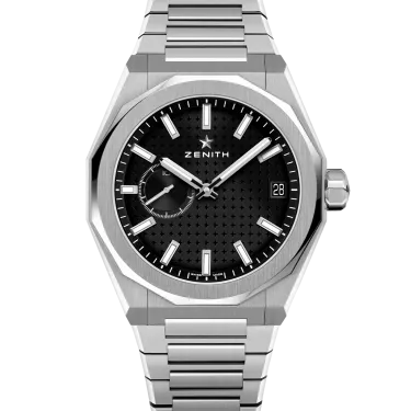 Montre DEFY Skyline dotée d’un boîtier octogonal en acier de 41 mm rehaussé d’une lunette à facettes, avec un cadran noir à motif soleillé revisitant l'emblématique étoile à quatre branches de ZENITH. Animée par le mouvement de manufacture automatique à haute fréquence El Primero 3620 avec le tout premier indicateur au 1/10e de seconde. Bracelet en acier interchangeable et bracelet en caoutchouc à motifs noirs.