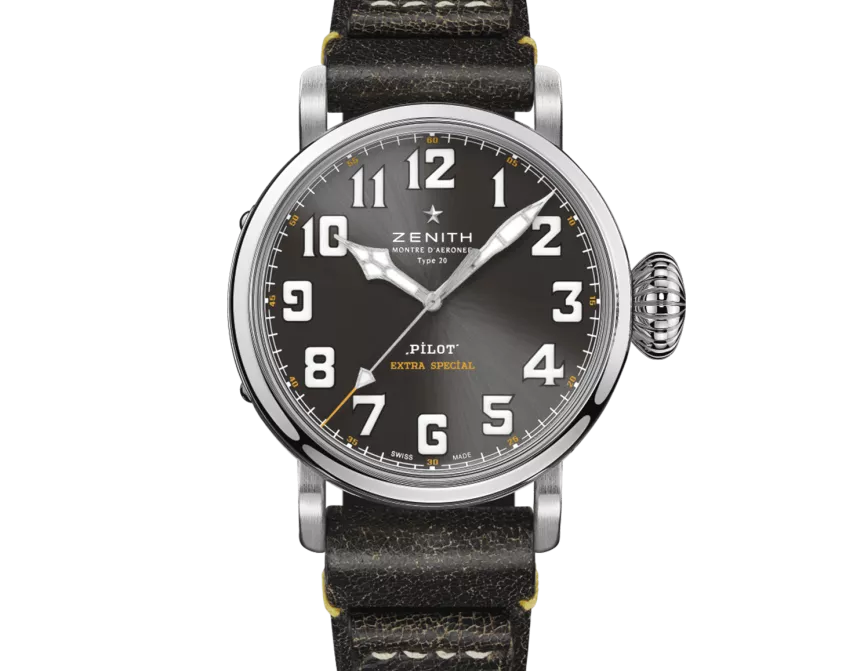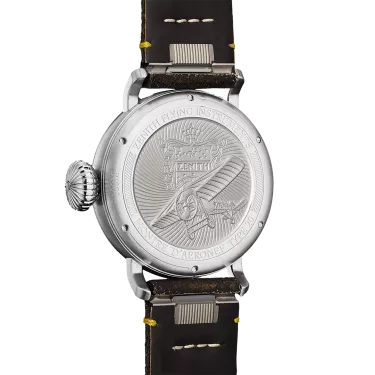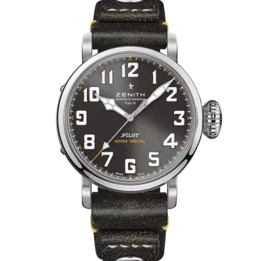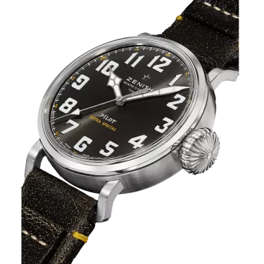 Nouveau boîtier en acier brossé de 45 mm, Chiffres arabes entièrement faits de SuperLuminova, Fond de boîtier orné du logo des instruments d’aviation Zenith et Inspiré par les légendaires montres d’aviation Zenith. Un instrument moderne au charme analogique des temps passés : montre PILOT Type 20 Rescue logée dans un boîtier en acier inoxydable poli de 45 mm avec cadran soleillé noir rehaussé de notes jaunes. Modèle équipé d’un bracelet en cuir de veau noir vieilli avec rivets et surpiqûres jaunes.