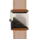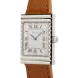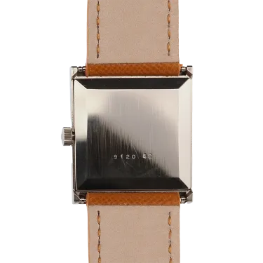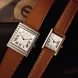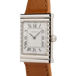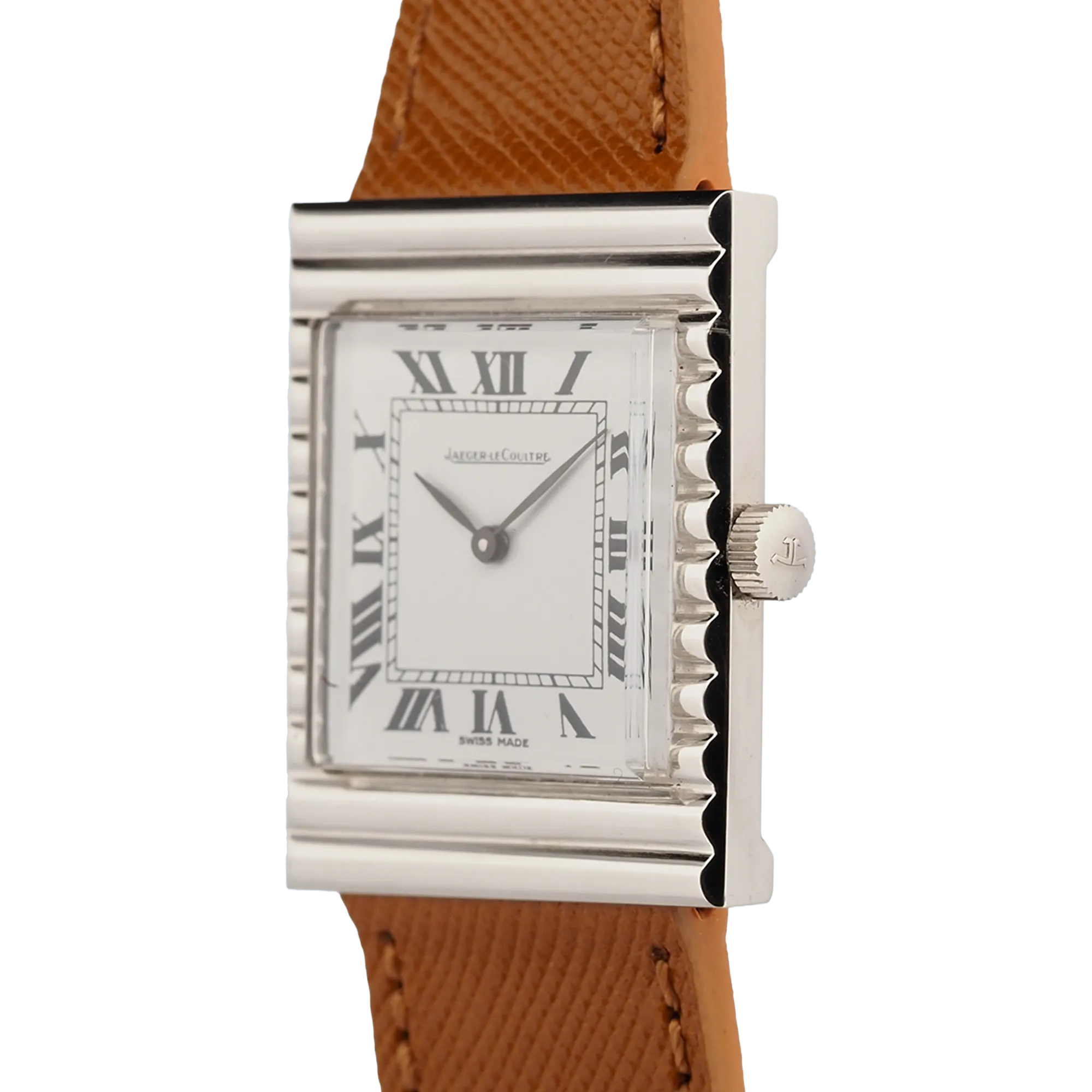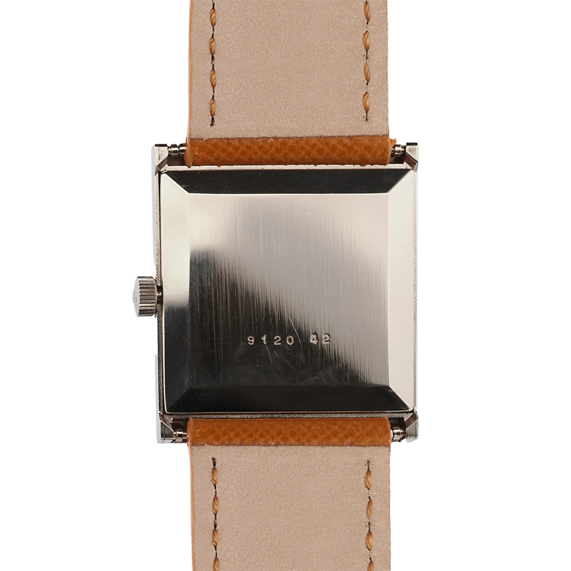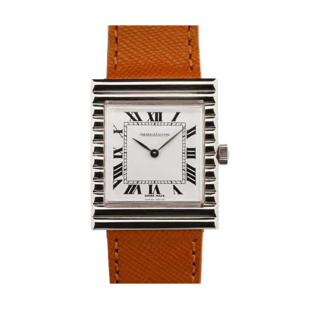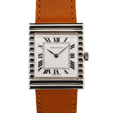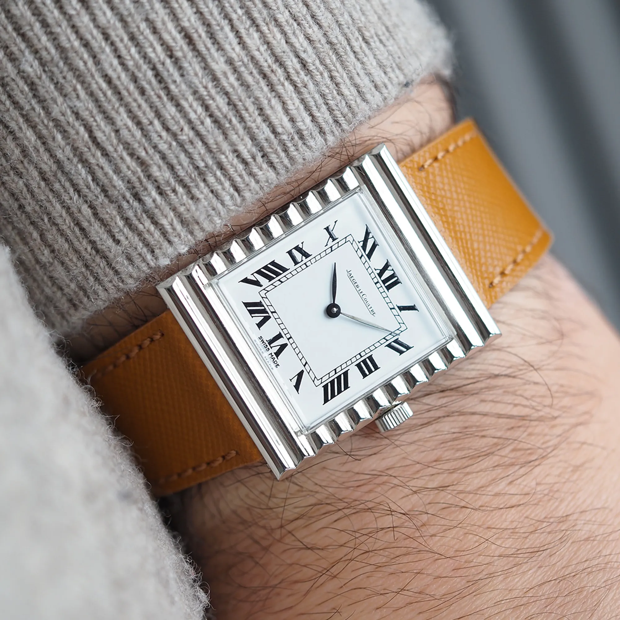 Son boîtier à la forme singulière mesure 28 x 33 mm et renferme un cadran blanc orné d’index en chiffres romains noirs, accompagné d’un chemin de fer également noir pour l’indication des minutes. Son esthétique générale évoque fortement les modèles Tank de Cartier par son cadran, tout en rappelant les Cellini de Rolex grâce à la forme régulière de son boîtier. Elle est équipée du calibre manuel Jaeger-LeCoultre 818, récemment révisé.