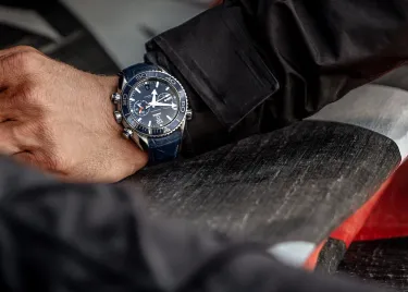 Die Omega Seamaster Planet Ocean 600M ist, wie ihr Name schon andeutet, für den Ozean gemacht. Mit einer beeindruckenden Wasserdichtigkeit von 600 Metern, einer einseitig drehbaren Taucherlünette aus blauer Keramik mit einer Taucherskala aus Liquidmetal™ und einer verlängerbaren Faltschließe, die sich über einem Neoprenanzug anbringen lässt, ist sie ein ernstzunehmendes Ausrüstungsstück. Hier ist sie beim America's Cup fotografiert, wo nichts dem Zufall überlassen wird!