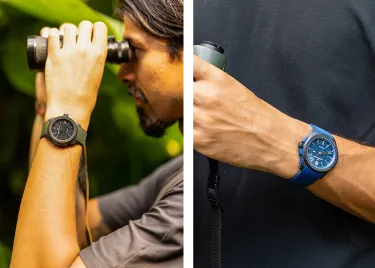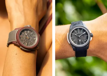 Vier neue Modelle in unterschiedlichen Farben also: Zunächst wäre da die Ausführung mit blauem Zifferblatt und schwarzem Gehäuse sowie eine weitere Version mit grauem Zifferblatt und bordeauxrotem Gehäuse (limitierte Auflage von 200 Stück). Ausserdem sind zwei weitere Optionen mit schwarzem Zifferblatt verfügbar: eine mit einem khakifarbenen Armband und die auf 500 Stück limitierte Uhr Hakuna Mipaka mit einem Zifferblatt in Löwenfell-Optik, beide eingefasst in einem schwarzen Gehäuse.