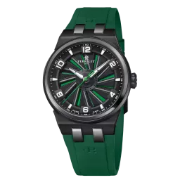 Die neue Perrelet Turbine Titanium 41 Green ist ein kühnes und stilvolles Schmuckstück, das alle Blicke auf sich zieht. Die Uhr ist aus leichtem und haltbarem Titan mit einer schwarzen DLC-Beschichtung gefertigt, die kratzfest ist und sich im Laufe der Zeit nicht verändert. Das ikonische Turbinenzifferblatt verfügt über ein leuchtend grünes Hilfszifferblatt, das zum Leben erwacht, wenn sich die Turbine dreht. Das Kautschukarmband ist ebenfalls grün und sorgt für ein einheitliches und auffälliges Erscheinungsbild.