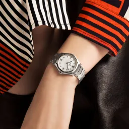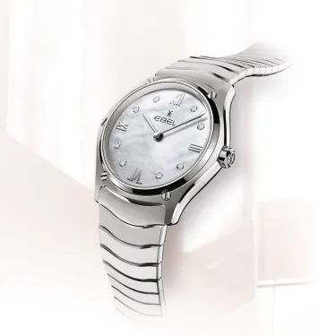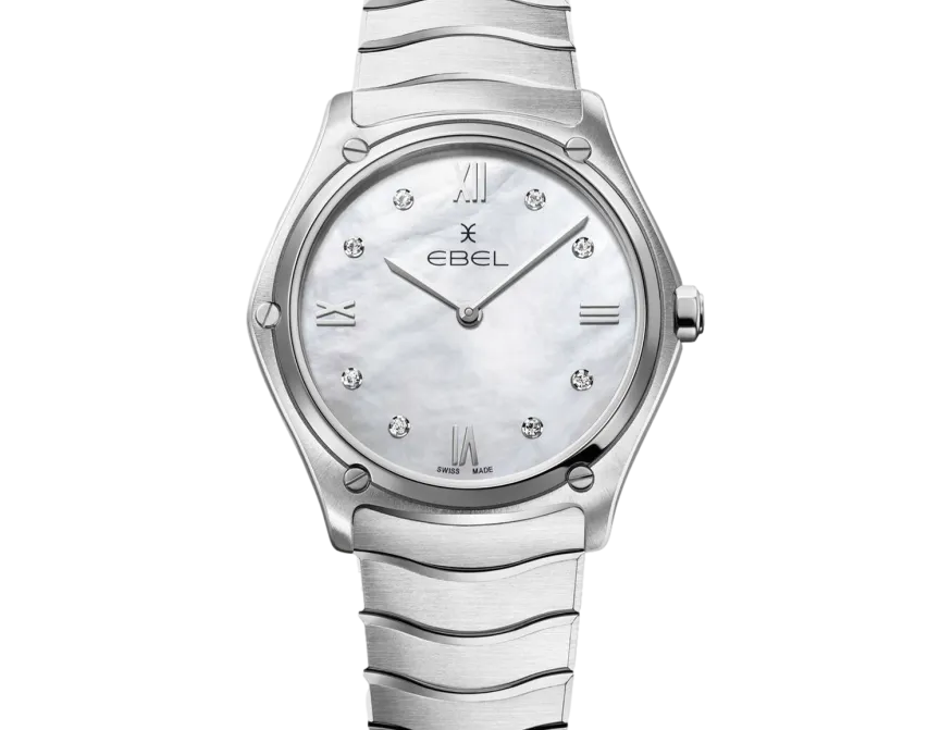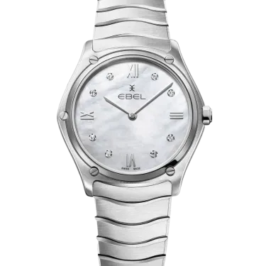 Damenuhr EBEL Sport Classic, Edelstahlgehäuse, Ø 33 mm, Perlmuttzifferblatt mit aufgesetzten römischen Ziffern und 8 Diamanten (0,052 ct), Saphirglas mit Antireflexbeschichtung, Edelstahl-Wellenarmband mit Faltschließe, Schweizer Quarzwerk, wasserdicht bis 5 bar.
