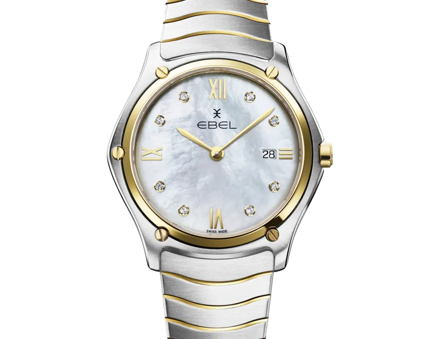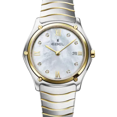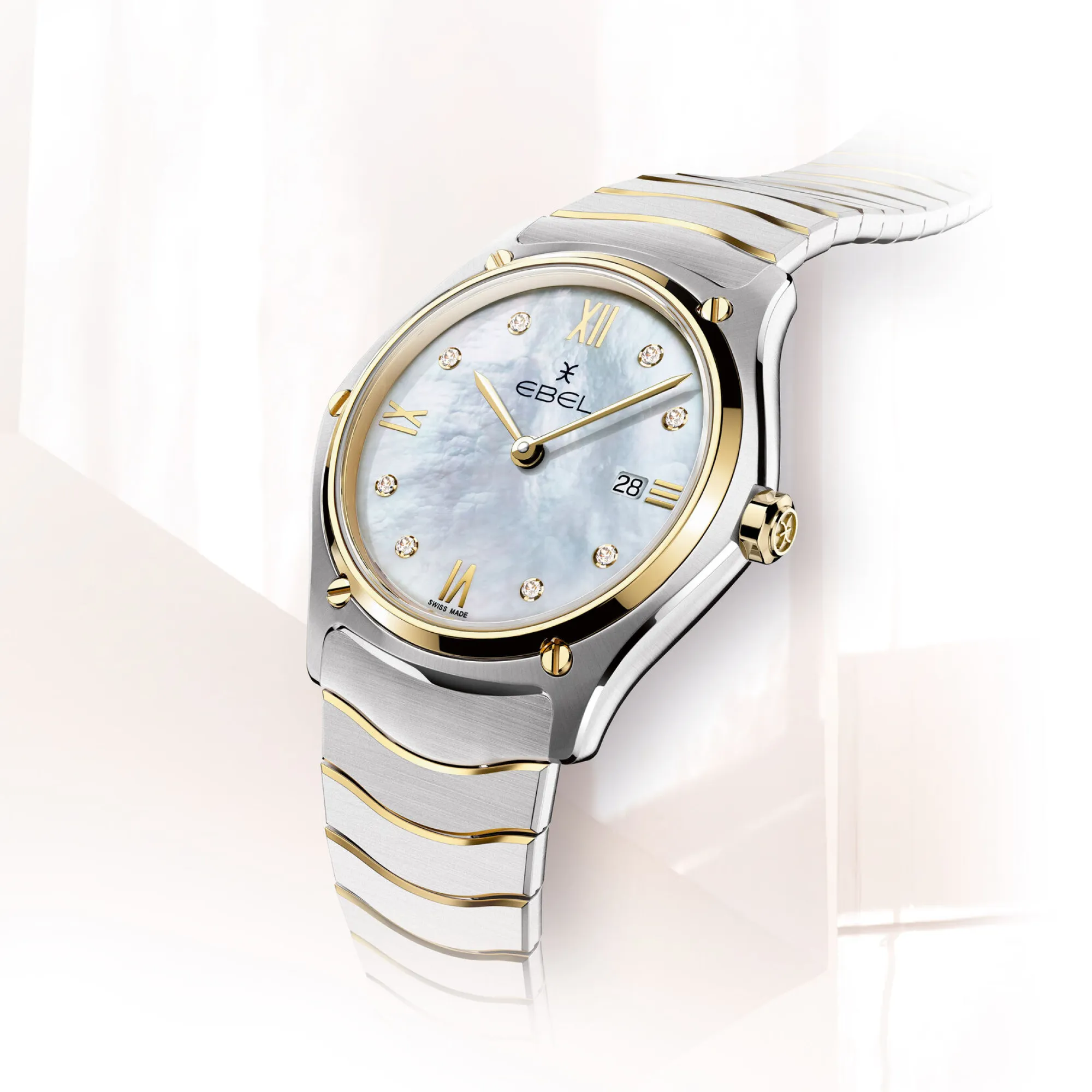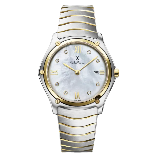 EBEL Sport Classic Uhr, Gehäuse aus Edelstahl und 18 Karat Gelbgold, Ø 37 mm, Perlmuttzifferblatt mit aufgesetzten römischen Ziffern und 8 Diamanten (0,104 Karat), Saphirglas mit Antireflexbeschichtung, zweifarbiges Edelstahl-Wellenarmband mit Faltschließe, Schweizer Quarzwerk, wasserdicht bis 5 bar.