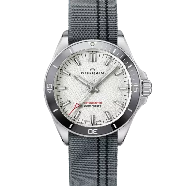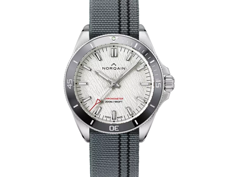 Die Adventure NEVEREST Glacier hat einen Durchmesser von 40mm und verfügt über einen automatischen Aufzug. Sie besticht mit einem silbernen Look, der einen fesselt – von ihrem satinierten Gehäuse aus gebürstetem Edelstahl bis zur grauen Lünette und dem Zifferblatt. Rote Akzente bei der Nullmarkierung der Lünette, beim zentralen Sekundenanzeiger und bei der Beschriftung des Chronometers heben sich vom rissig-weissen Hintergrund des Zifferblattes ab. Dessen Risse sind den zerklüfteten Gletscherspalten des Khumbu-Eisbruchs nachempfunden, der als gefährlichster Abschnitt bei der Besteigung des Mount Everest gilt. Die Stunden-, Minuten- und Sekundenzeiger sowie die Markierungen sind überzogen mit X1 Superluminova, das 60 % stärker leuchtet als handelsübliches Superluminova. Die «Glacier» ist wasserfest bis in 200 Metern Tiefe und wurde ausgestattet mit NORQAINS Manufakturwerk NN20/1, welches durch ihren Saphirglasboden zu sehen ist.