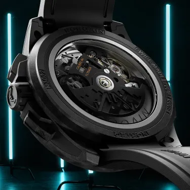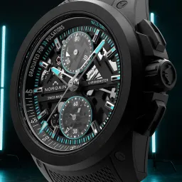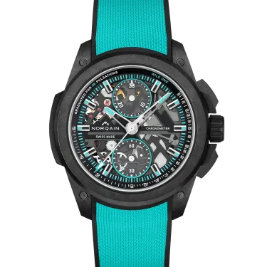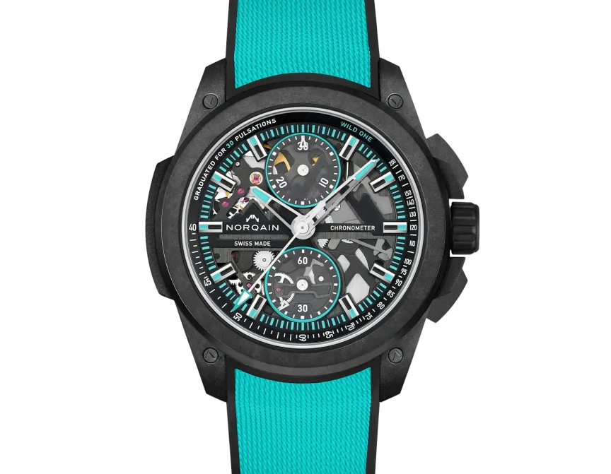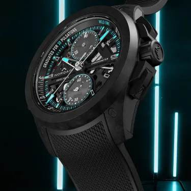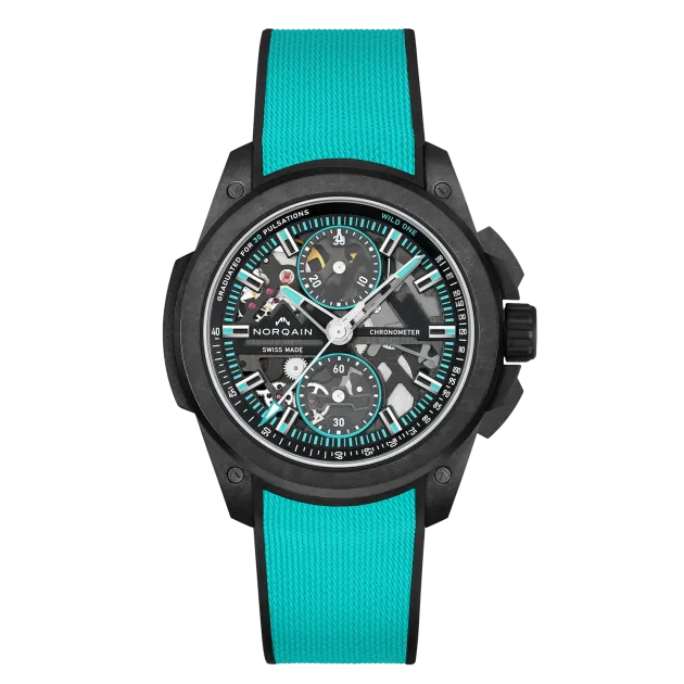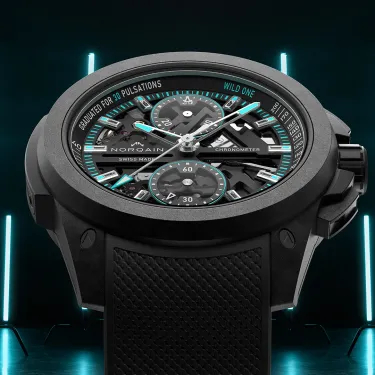 Die neue Wild ONE Skeleton Chrono besticht durch ihr markantes, leistungsstarkes Design. Ihre schwebenden transparenten Scheiben unterstreichen die Leichtigkeit der Uhr und bieten gleichzeitig einen noch besseren Blick auf das NORQAIN 8K Manufakturkaliber. Als wahrhaft sportlicher und dynamischer Zeitmesser ist die Wild ONE Chrono für Action gemacht: stoßfest, leistungsstark und so konstruiert, dass sie mit intensiven Wettkämpfen und energiegeladenen Momenten Schritt halten kann.