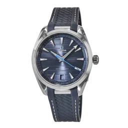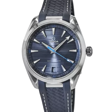 Die Seamaster Aqua Terra ist ein Tribut an OMEGAs großes maritimes Erbe. Das symmetrische Gehäuse dieses 41-mm-Modells besteht aus Edelstahl und ist auf der Rückseite mit einem Wellendekor versehen. Das blaue Zifferblatt zeichnet sich durch ein horizontales „Teak“-Dekor aus, das sich an den hölzernen Deckplanken von Luxus-Segeljachten inspiriert. Das Zifferblatt verfügt außerdem über ein Datumsfenster bei 6 Uhr und die rhodinierten Zeiger und Indizes sind mit weißer Super-LumiNova gefüllt. Für den zentralen Sekundenzeiger und die vier Viertelstunden-Ziffern auf dem Minutenring wurde Blau verwendet. Das graue Armband aus strukturiertem Kautschuk ist mit einer grauen Unterfütterung sowie einem Glied aus Edelstahl versehen, das es mit dem Gehäuse verbindet. Der Zeitmesser wird von dem OMEGA Master Chronometer Kaliber 8900 angetrieben, das vom Eidgenössischen Institut für Metrologie (METAS) zertifiziert wurde und höchsten Branchenstandards entspricht.