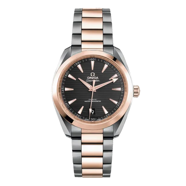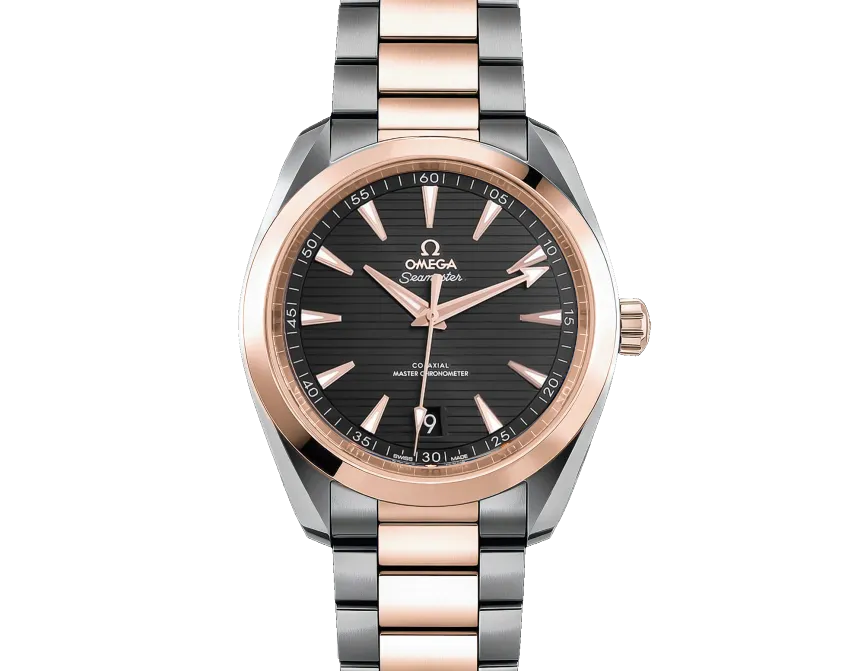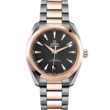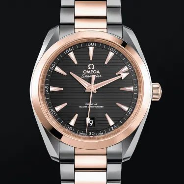 Omega Aqua Terra 41 Stahl Rose Gold Herrenuhr 220.20.41.21.06.001. Automatisches Uhrwerk mit Selbstaufzug. Gehäuse aus Edelstahl und 18 Karat Roségold mit einem Durchmesser von 41 mm. Krone aus 18 Karat Roségold mit Omega-Logo. Gehäuseboden aus transparentem Saphirglas. Glatte Lünette aus 18 Karat Roségold. Kratzfestes Saphirglas. Graues Zifferblatt mit horizontalem Teakholzmuster, Zeiger und Indexe mit Leuchtmasse. Datumsfenster bei 6 Uhr. Armband aus Edelstahl und Roségold mit doppelter Faltschließe mit Druckknopf.