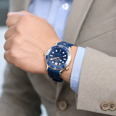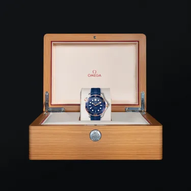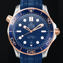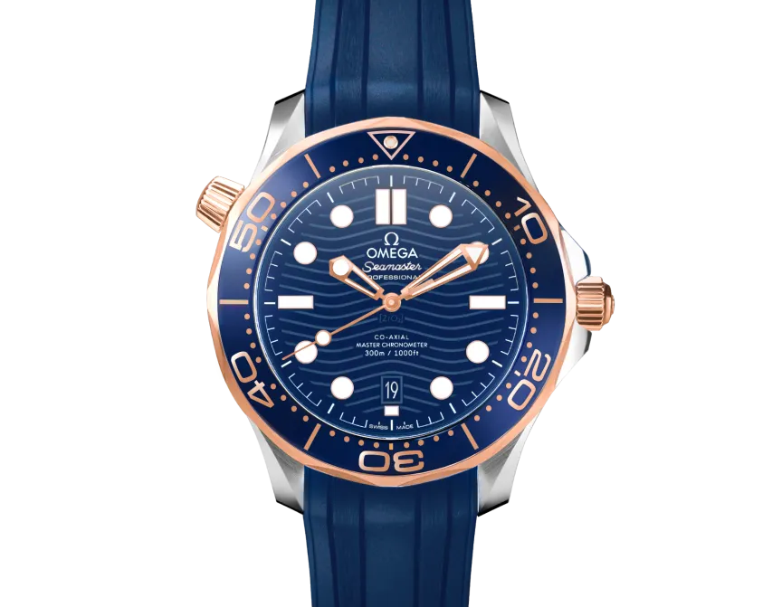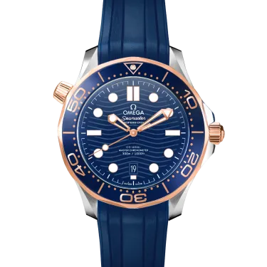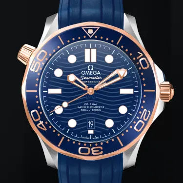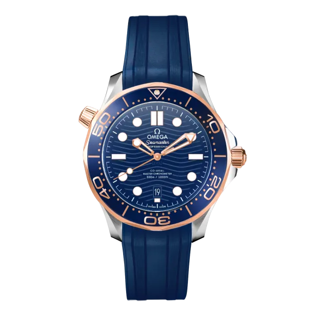 Omega Seamaster Diver 300M 42 mm aus Edelstahl und 18 K Sedna™-Gold besticht durch eine blaue Keramiklünette mit einer Tauchskala aus Ceragold™. Das Zifferblatt besteht ebenfalls aus polierter blauer Keramik und verfügt ferner über lasergravierte Wellen und ein Datumsfenster bei 6 Uhr. Die skelettierten Zeiger und erhabenen Indizes sind aus 18 K Sedna™-Gold gefertigt und mit weißer Super-LumiNova gefüllt. Das Heliumauslassventil weist eine konische Form auf. Angetrieben wird die Uhr mit blauem Kautschukarmband vom OMEGA Master Chronometer-Kaliber 8800, das durch das Saphirglas des Gehäusebodens mit gewelltem Rand bewundert werden kann.