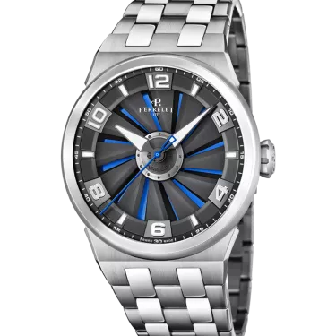 Die Turbinensammlung feiert 2019 ihr 10-jähriges Bestehen. Zum Gedenken an diesen wichtigen Meilenstein bringt Perrelet die TURBINE EVO mit einem komplett überarbeiteten Design und einem neuen hauseigenen Uhrwerk mit dem Kaliber P-331-MH heraus. Die Turbine EVO ist in einem neuen, sportlich-schicken Gehäuse untergebracht, das nun ein Edelstahlarmband bietet. Zum ersten Mal in ihrer zehnjährigen Geschichte sind alle Uhrwerke, die diese Kollektion ausstatten, COSC-zertifiziert, was nach einer Reihe von Tests die hohe Präzision der Zeitmessung bezeugt. Funktionen zentrale Zeiger, die Stunden, Minuten und Sekunden anzeigen; 5 ATM; schwarzes, blaues Unterzifferblatt und Faltschließe. Eigenes Automatikwerk Kaliber P-331-MH, 42 Stunden Gangreserve.