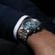 Das 43,5-mm-Edelstahlgehäuse ist mit einer Mischung aus gebürsteten und polierten Oberflächen sowie einem 5-reihigen Edelstahlarmband ausgestattet. Sowohl die Zeiger als auch die Indizes sind mit einer lumineszierenden Beschichtung versehen, die auch bei schwachem Licht für eine gute Lesbarkeit sorgt. Die Lünette mit blauer, kratzfester Keramikeinlage mit Tachymeterskala trägt zu dem edlen und luxuriösen Erscheinungsbild der Uhr bei. Das rauchige Zifferblatt mit einer verzierten Stundenskala und die mit silberfarbenen Ringen gerahmten Zähler verleihen dem Modell den letzten Schliff.