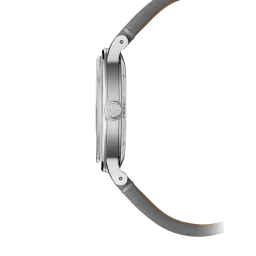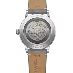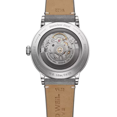 Die Lünette ist mit einem vertikalen Satin-Strich verziert, der wunderschön mit der daneben liegenden, hochglanzpolierten Abschrägung kontrastiert. Diese Nebeneinanderstellung zweier Verarbeitungen verleiht dem Modell ein besonders aufwendiges Finish. Der Gehäuseboden aus Saphirglas gibt den Blick auf das Automatikwerk im Herzen der Uhr sowie die für RAYMOND WEIL charakteristische W-förmige Schwungmasse frei. Das graue Armband aus echtem Kalbsleder ist mit einer einzigartigen W-förmigen Naht verziert.